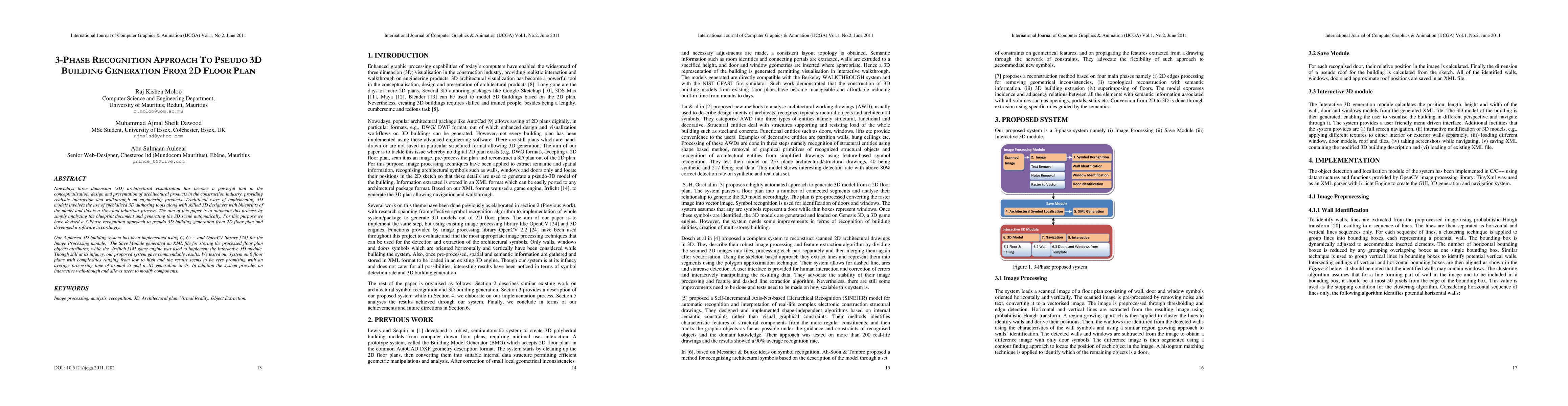 This paper proposes a 3-Phase recognition approach to automate the generation of pseudo 3D building models from 2D floor plans. The system, implemented in C, C++, and OpenCV, aims to eliminate the need for specialized 3D tools and skilled designers, offering promising results with an average processing time of 3 seconds and 3D generation in 4 seconds.