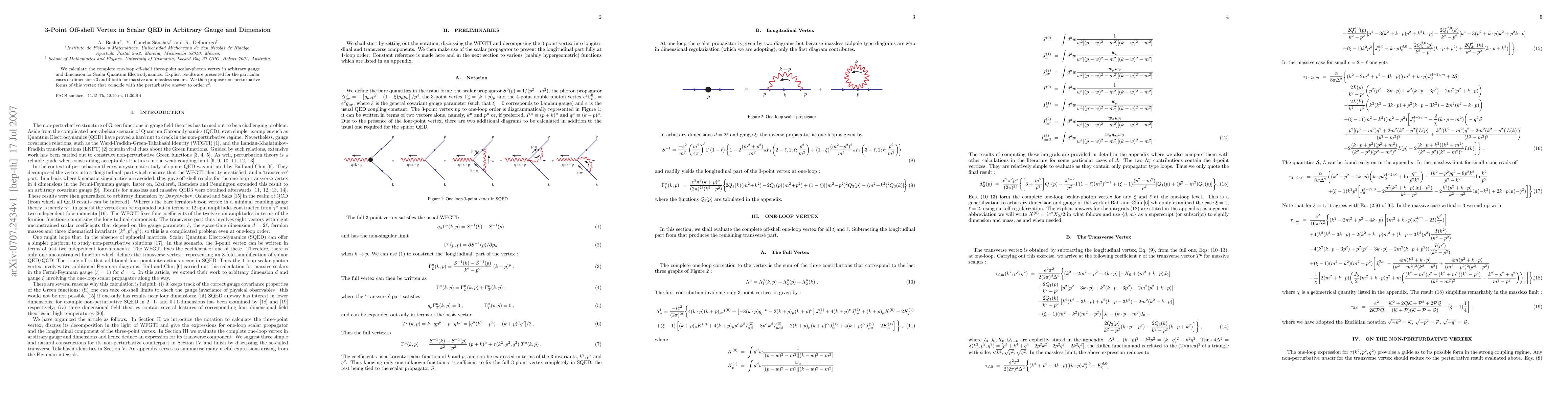 This paper calculates the complete one-loop off-shell three-point vertex in scalar QED for arbitrary gauge and dimensions, presenting explicit results for dimensions 3 and 4, and proposes non-perturbative forms matching the perturbative results up to order $e^2$.