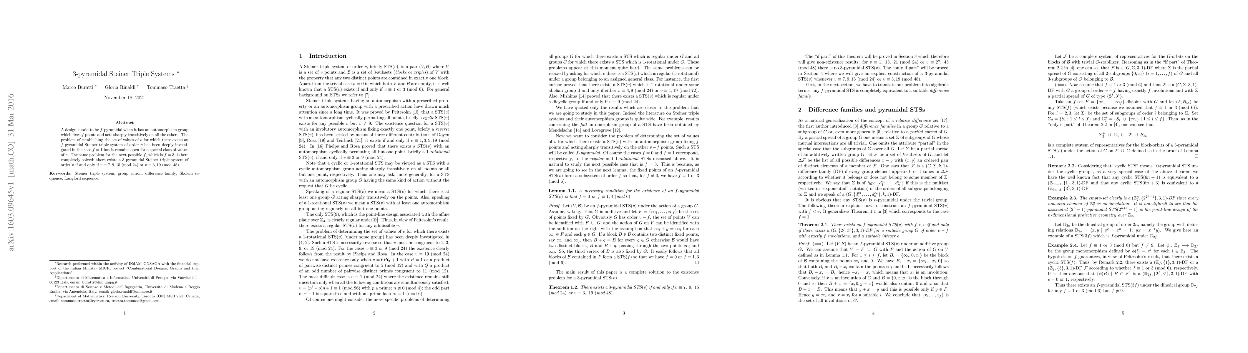 A design is said to be $f$-pyramidal when it has an automorphism group which fixes $f$ points and acts sharply transitively on all the others. The problem of establishing the set of values of $v$ for which there exists an $f$-pyramidal Steiner triple system of order $v$ has been deeply investigated in the case $f=1$ but it remains open for a special class of values of $v$. The same problem for the next possible $f$, which is $f=3$, is here completely solved: there exists a $3$-pyramidal Steiner triple system of order $v$ if and only if $v\equiv7,9,15$ (mod $24$) or $v\equiv 3, 19$ (mod 48).