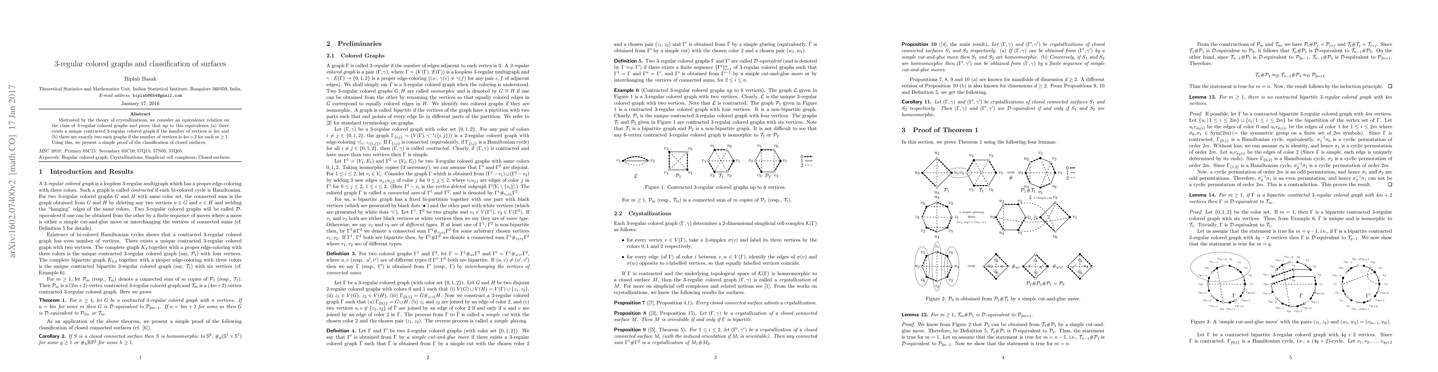 This paper explores an equivalence relation on 3-regular colored graphs, proving unique contracted graphs for even vertex counts and two for odd counts, which leads to a straightforward proof of the classification of closed surfaces.