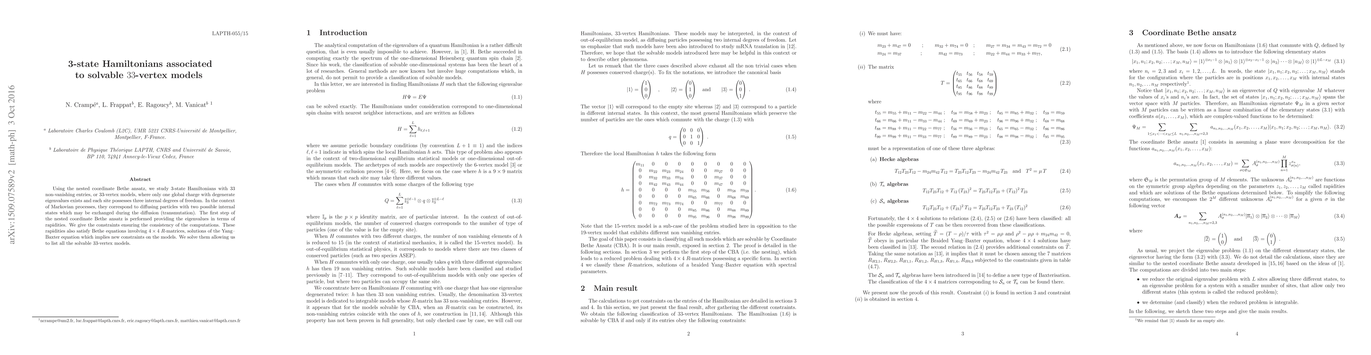 Using the nested coordinate Bethe ansatz, we study 33-vertex models, where only one global charge with degenerate eigenvalues exists and each site possesses three internal degrees of freedom. In the context of Markovian processes, they correspond to diffusing particles with two possible internal states which may be exchanged during the diffusion (transmutation). The first step of the nested coordinate Bethe ansatz is performed providing the eigenvalues in terms of rapidities. We give the constraints ensuring the consistency of the computations. These rapidities also satisfy Bethe equations involving $4\times 4$ R-matrices, solutions of the Yang--Baxter equation which implies new constraints on the models. We solve them allowing us to list all the solvable 33-vertex models.