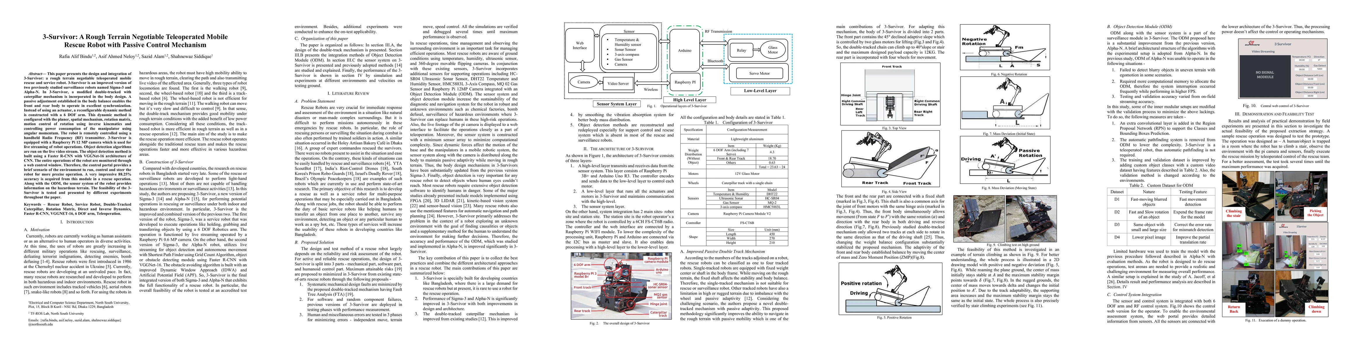 This paper introduces 3 Survivor, an advanced teleoperated mobile rescue robot with a passive control mechanism for rough terrain navigation. It features a reconfigured dynamic 6 DOF arm, object detection using Faster RCNN, and a Raspberry Pi camera for livestreaming, achieving an 88.25% accuracy rate in rescue operations.