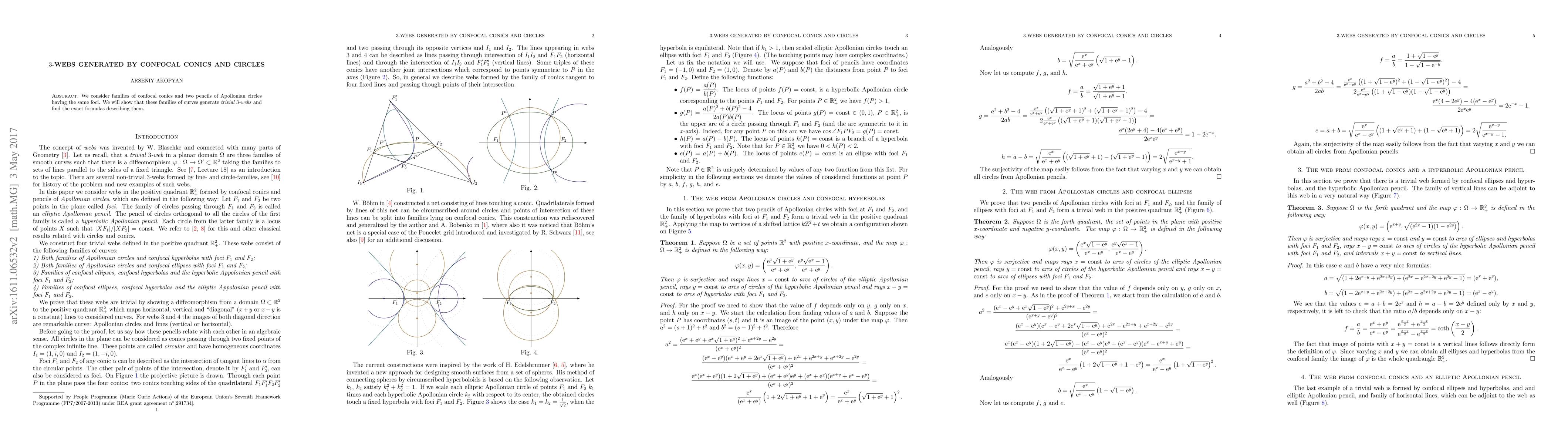 The paper presents detailed proofs and formulas for trivial 3-webs generated by confocal conics and Apollonian circles, showcasing surjective mappings between specific curve families and their arcs in the positive quadrant.
