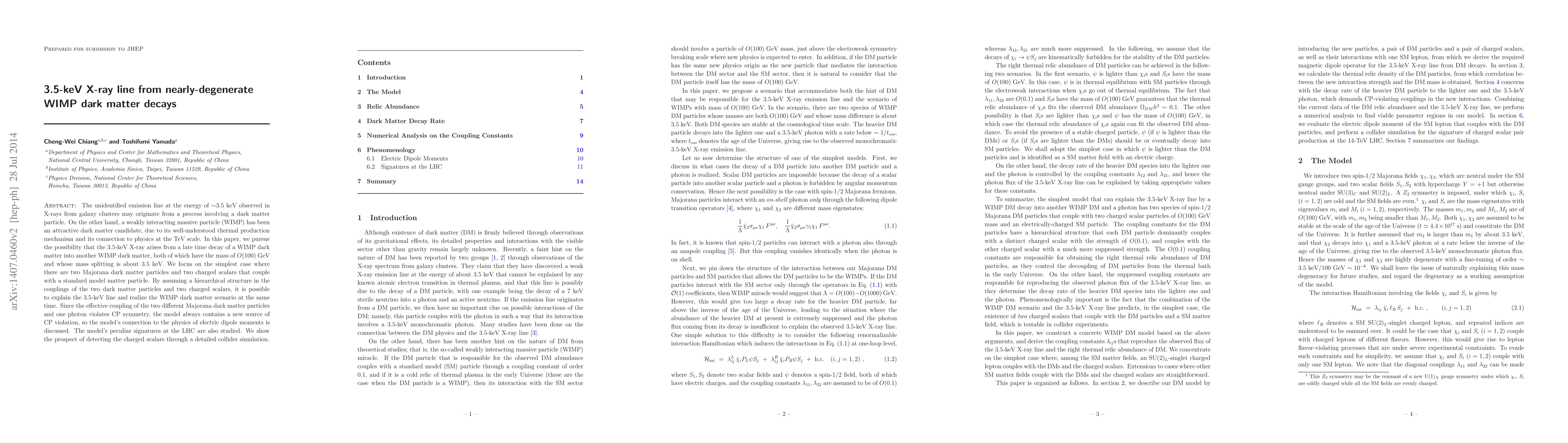 The paper presents a novel dark matter model that explains the 3.5-keV X-ray line through nearly-degenerate WIMP decays, incorporating CP-violating interactions and predicting distinct signatures at the LHC.