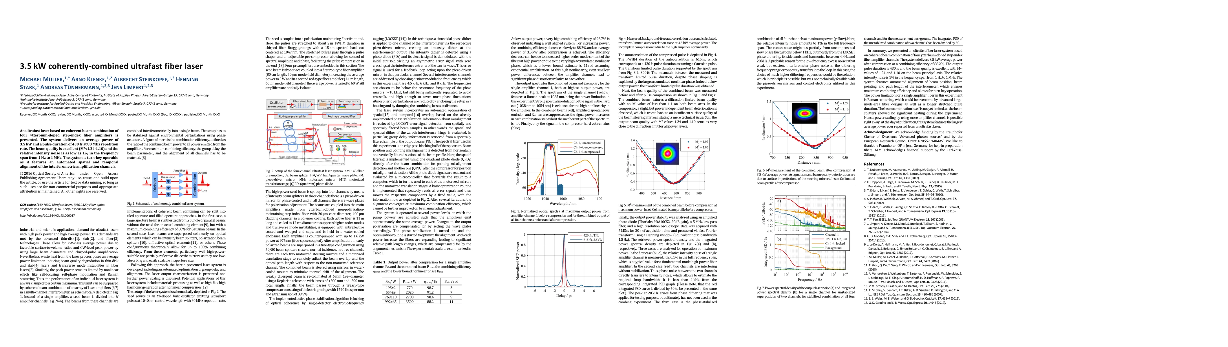 This paper presents an ultrafast fiber laser system that coherently combines four ytterbium-doped fiber amplifiers to deliver 3.5 kW average power, 430 fs pulse duration, and 80 MHz repetition rate, with excellent beam quality and low relative intensity noise. The system includes automated alignment for optimal operation.