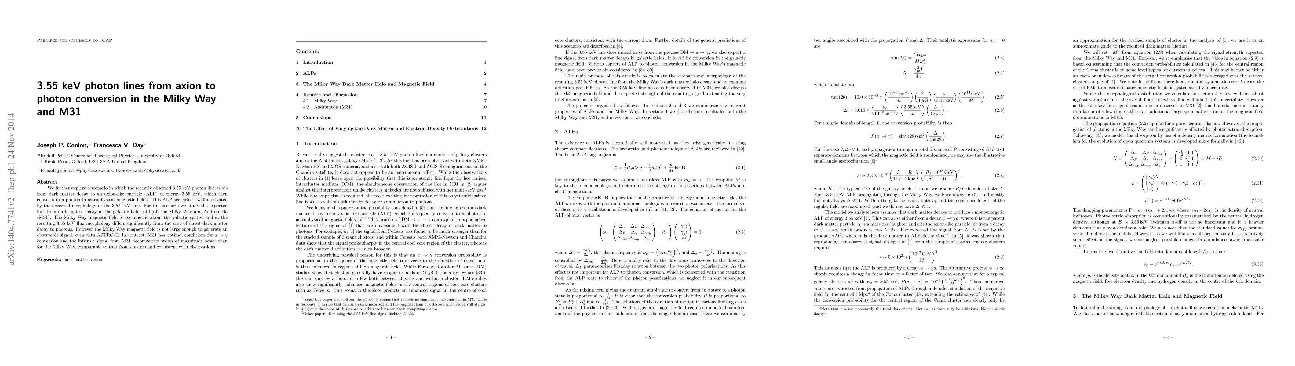 This paper investigates the possibility that the 3.55 keV photon line originates from dark matter decaying into an axion-like particle (ALP) that converts to a photon in magnetic fields. While the Milky Way's magnetic field is asymmetric, it is insufficient for observable signal generation, whereas M31's conditions favor ALP to photon conversion, producing a significantly stronger signal.