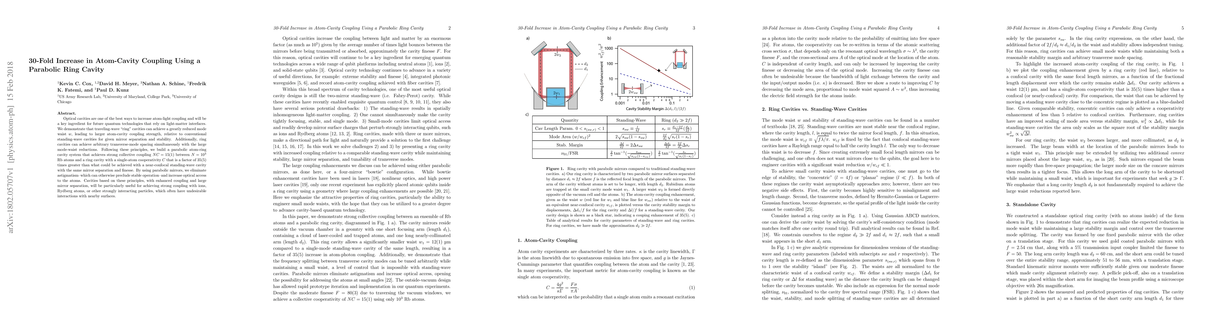 This paper demonstrates a significant 30-fold increase in atom-cavity coupling using a parabolic ring cavity, achieving strong collective coupling and enhanced single-atom cooperativity compared to conventional standing-wave cavities. The use of parabolic mirrors eliminates astigmatism, allowing for stable operation and better optical access for atoms.