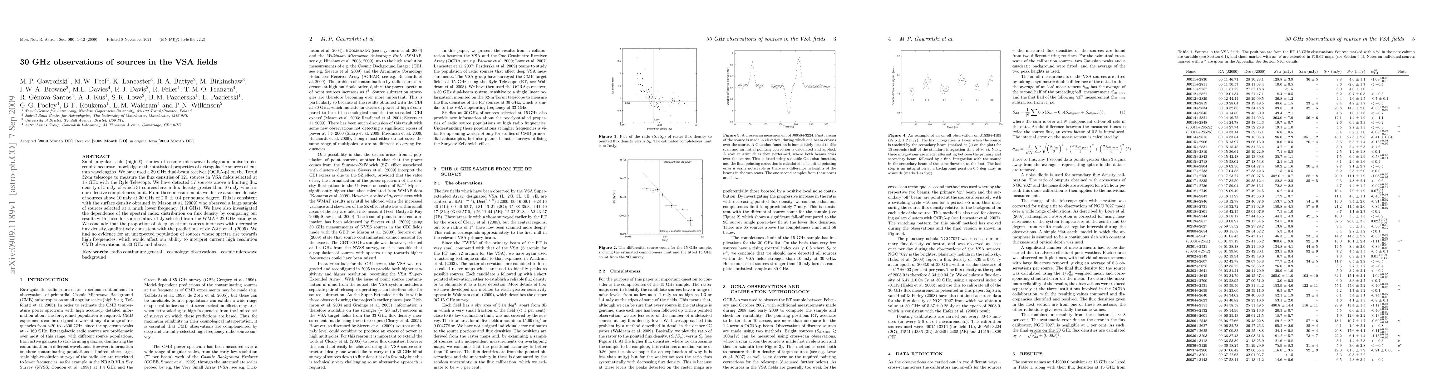 Small angular scale (high l) studies of cosmic microwave background anisotropies require accurate knowledge of the statistical properties of extragalactic sources at cm-mm wavelengths. We have used a 30 GHz dual-beam receiver (OCRA-p) on the Torun 32-m telescope to measure the flux densities of 121 sources in VSA fields selected at 15 GHz with the Ryle Telescope. We have detected 57 sources above a limiting flux density of 5mJy, of which 31 sources have a flux density greater than 10mJy, which is our effective completeness limit. From these measurements we derive a surface density of sources above 10mJy at 30 GHz of 2.0+/-0.4 per square degree. This is consistent with the surface density obtained by Mason et al. (2009) who observed a large sample of sources selected at a much lower frequency (1.4 GHz). We have also investigated the dependence of the spectral index distribution on flux density by comparing our results with those for sources above 1 Jy selected from the WMAP 22 GHz catalogue. We conclude that the proportion of steep spectrum sources increases with decreasing flux density, qualitatively consistent with the predictions of deZotti et al. (2005). We find no evidence for an unexpected population of sources whose spectra rise towards high frequencies, which would affect our ability to interpret current high resolution CMB observations at 30 GHz and above.