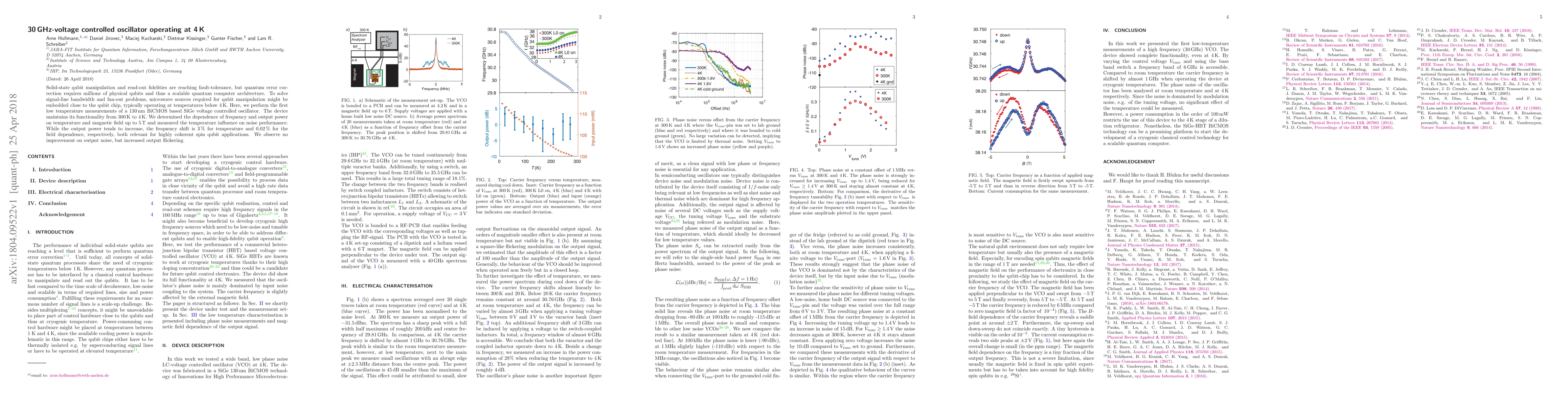 Solid-state qubit manipulation and read-out fidelities are reaching fault-tolerance, but quantum error correction requires millions of physical qubits and thus a scalable quantum computer architecture. To solve signal-line bandwidth and fan-out problems, microwave sources required for qubit manipulation might be embedded close to the qubit chip, typically operating at temperatures below 4 K. Here, we perform the first low temperature measurements of a 130 nm BiCMOS based SiGe voltage controlled oscillator. The device maintains its functionality from 300 K to 4 K. We determined the dependence of frequency and output power on temperature and magnetic field up to 5 T and measured the temperature influence on noise performance. While the output power tends to increase, the frequency shift is 3 % for temperature and 0.02 % for the field dependence, respectively, both relevant for highly coherent spin qubit applications. We observe no improvement on output noise, but increased output flickering.