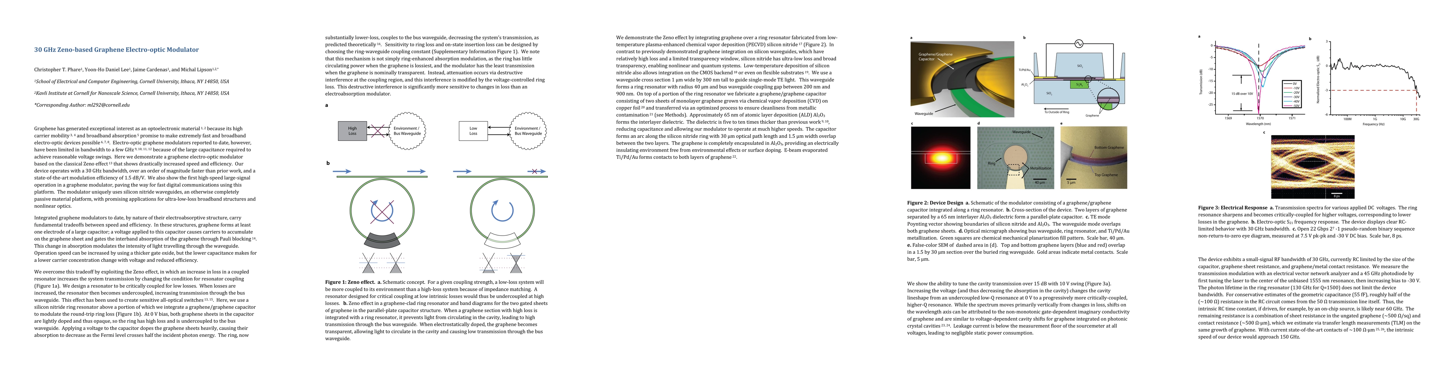 This paper demonstrates a graphene electro-optic modulator utilizing the Zeno effect to achieve a 30 GHz bandwidth, significantly outperforming previous devices by over an order of magnitude, with high modulation efficiency of 1.5 dB/V. The use of silicon nitride waveguides further enhances its potential for low-loss, broadband applications.