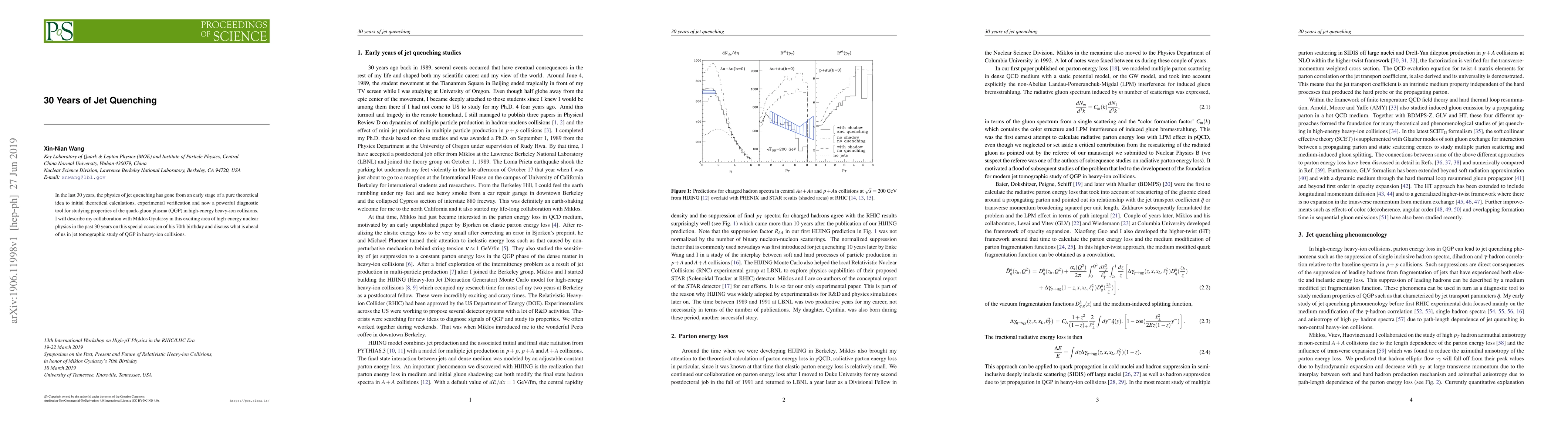 This paper reviews the 30-year evolution of jet quenching research, from theoretical inception to experimental validation, and its current role as a diagnostic tool for studying quark-gluon plasma in high-energy heavy-ion collisions. The author reflects on their collaboration with Miklos Gyulassy and looks forward to future advancements in jet tomography of QGP.