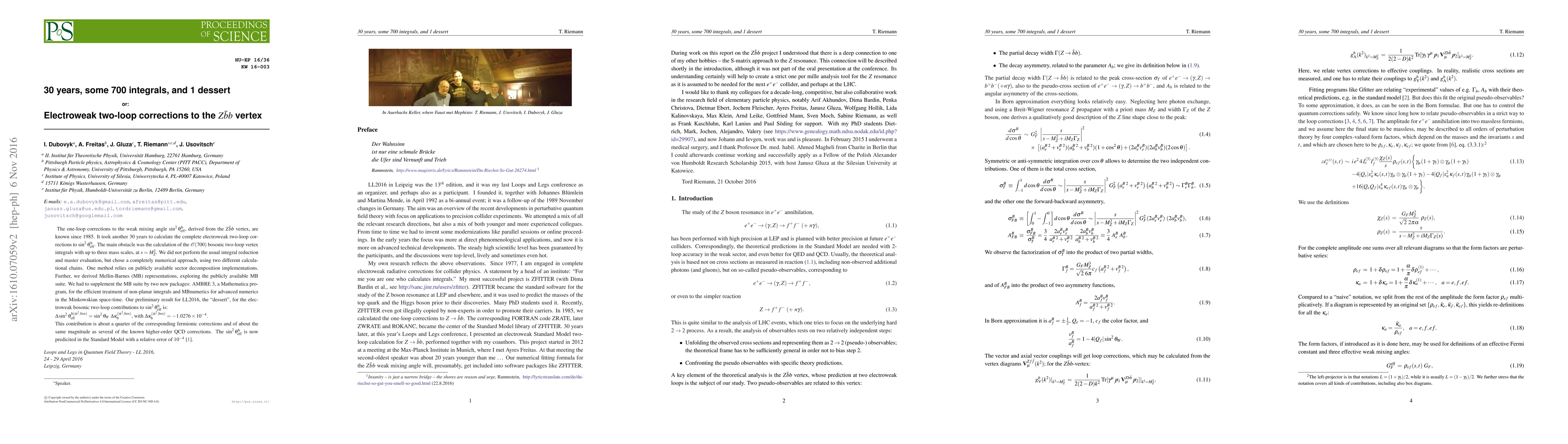 The one-loop corrections to the weak mixing angle $\sin^2\theta_{eff}^b$ derived from the $Z{\bar b}b$ vertex, are known since 1985. It took another 30 years to calculate the complete electroweak two-loop corrections to $\sin^2\theta_{eff}^b$. The main obstacle was the calculation of the O(700) bosonic two-loop vertex integrals with up to three mass scales, at $s=M_Z^2$. We did not perform the usual integral reduction and master evaluation, but chose a completely numerical approach, using two different calculational chains. One method relies on publicly available sector decomposition implementations. Further, we derived Mellin-Barnes (MB) representations, exploring the publicly available MB suite. We had to supplement the MB suite by two new packages: AMBRE~3, a Mathematica program, for the efficient treatment of non-planar integrals and MBnumerics for advanced numerics in the Minkowskian space-time. Our preliminary result for LL2016, the "dessert", for the electroweak bosonic two-loop contributions to $\sin^2\theta_{eff}^b$ is: $\Delta \sin^2\theta_{eff}^{b(\alpha^2,\rm bos)} = \sin^2\theta_W ~ \Delta\kappa_b^{(\alpha^2,bos)}$, with $\Delta\kappa_b^{(\alpha^2,bos)} = -1.0276 x 10^{-4}$. This contribution is about a quarter of the corresponding fermionic corrections and of about the same magnitude as several of the known higher-order QCD corrections. The $\sin^2\theta_{eff}^b$ is now predicited in the Standard Model with a relative error of $10^{-4}$ [1].
