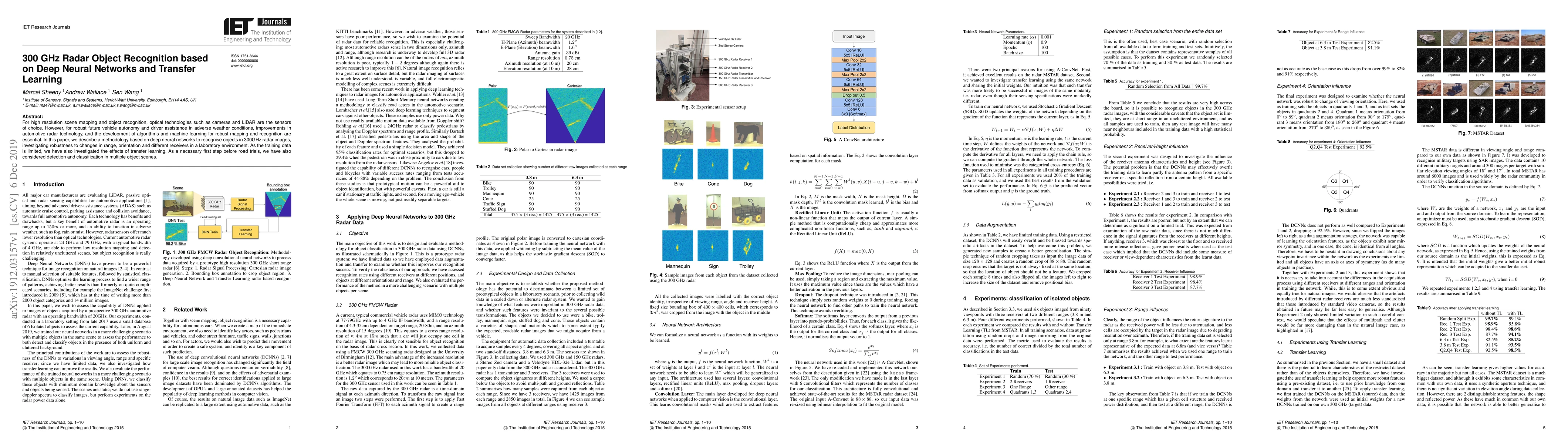For high resolution scene mapping and object recognition, optical technologies such as cameras and LiDAR are the sensors of choice. However, for robust future vehicle autonomy and driver assistance in adverse weather conditions, improvements in automotive radar technology, and the development of algorithms and machine learning for robust mapping and recognition are essential. In this paper, we describe a methodology based on deep neural networks to recognise objects in 300GHz radar images, investigating robustness to changes in range, orientation and different receivers in a laboratory environment. As the training data is limited, we have also investigated the effects of transfer learning. As a necessary first step before road trials, we have also considered detection and classification in multiple object scenes.
