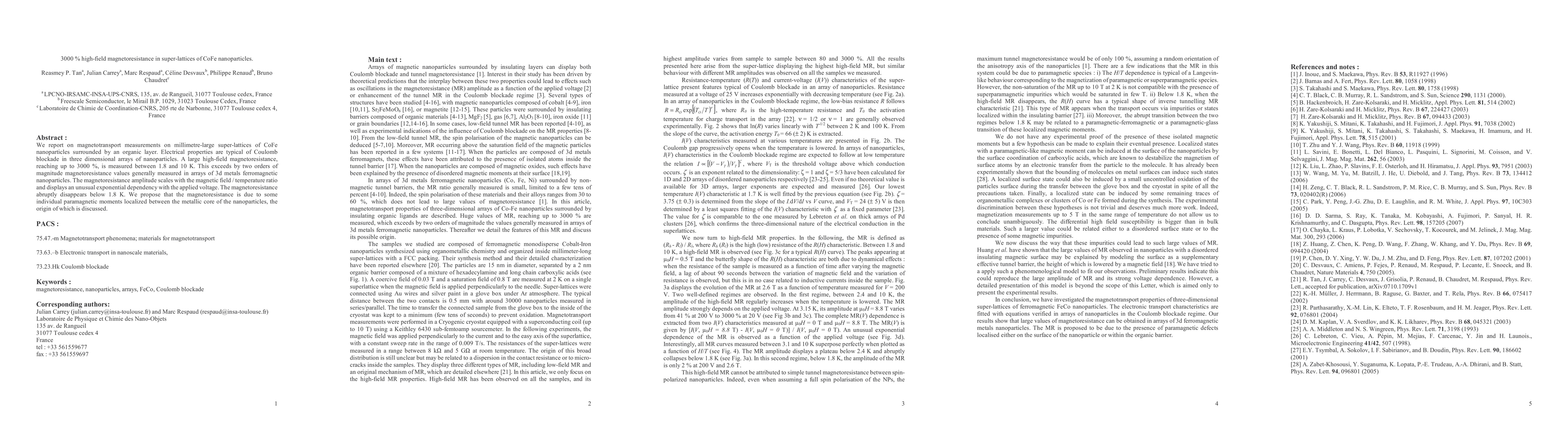 This study investigates magnetotransport in super-lattices of CoFe nanoparticles, revealing an extraordinary high-field magnetoresistance of up to 3000%. The observed magnetoresistance, which scales with the magnetic field/temperature ratio and exhibits an exponential voltage dependency, is attributed to localized paramagnetic moments between the metallic cores of the nanoparticles.