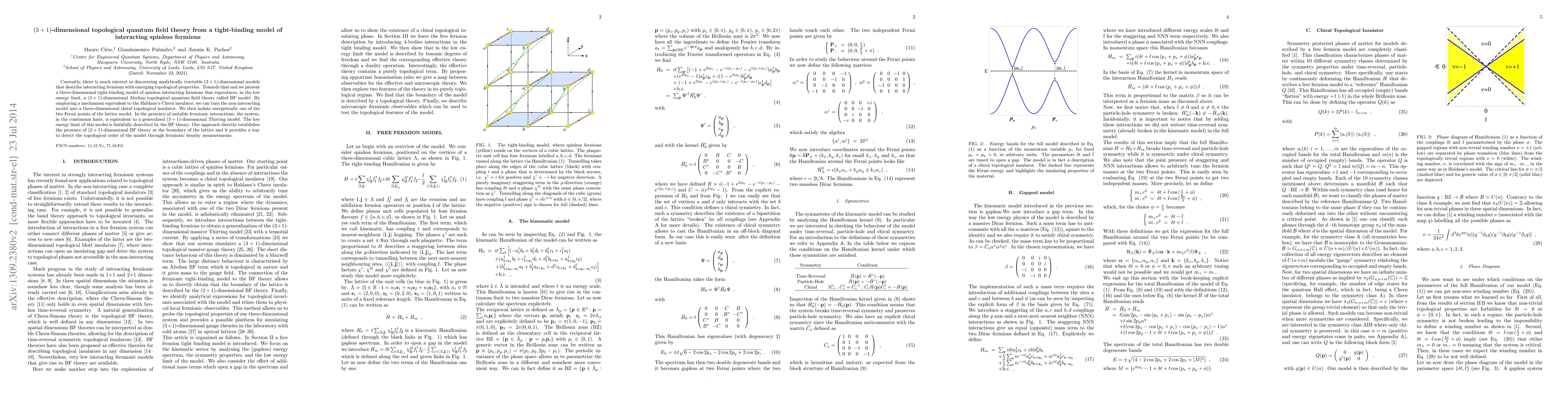 This paper presents a tight-binding model of spinless fermions that mimics a (3+1)-dimensional topological quantum field theory, specifically the BF model, by introducing interactions and isolating a Fermi point. The model demonstrates the emergence of topological order and can be linked to a generalised Thirring model in the continuum limit.