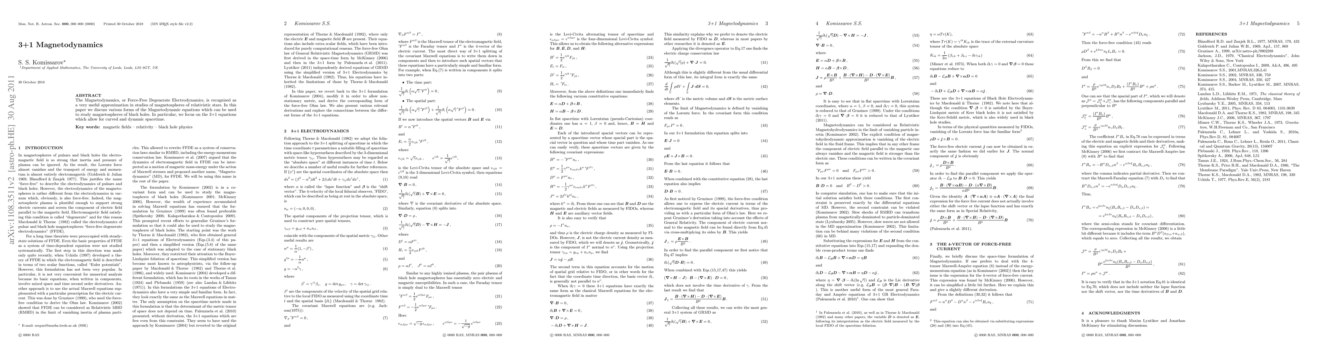 The Magnetodynamics, or Force-Free Degenerate Electrodynamics, is recognized as a very useful approximation in studies of magnetospheres of relativistic stars. In this paper we discuss various forms of Magnetodynamic equations which can be used to study magnetospheres of black holes. In particular, we focus on the 3+1 equations which allow for curved and dynamic spacetime.
