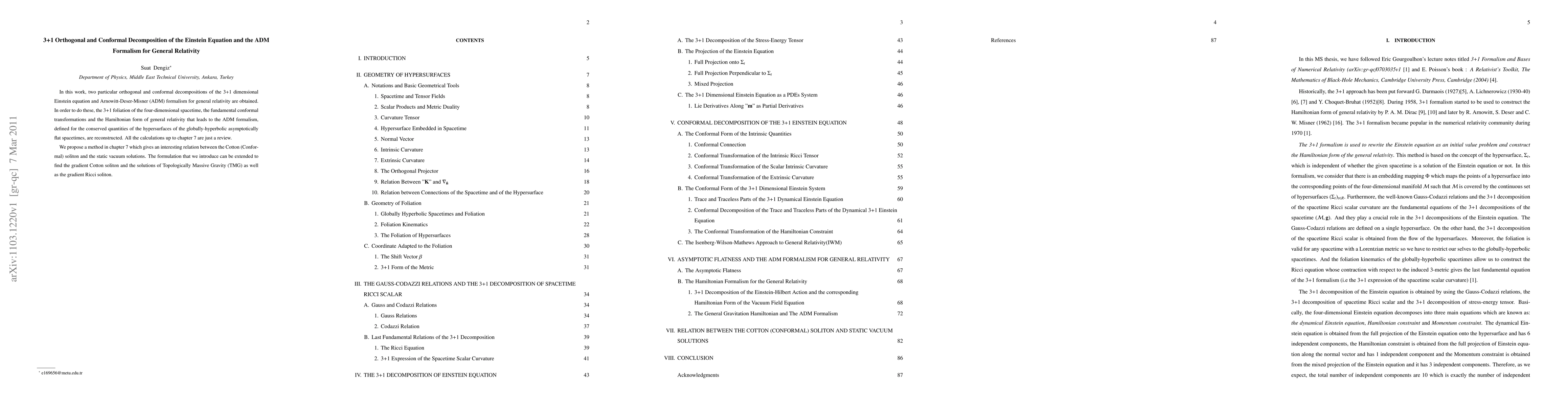 This paper reviews the orthogonal and conformal decompositions of the 3+1 dimensional Einstein equation and the ADM formalism for general relativity, focusing on the reconstruction of 3+1 foliation and Hamiltonian form. In chapter 7, a novel method is proposed that reveals a connection between the Cotton soliton and static vacuum solutions, extending to gradient Cotton solitons and solutions of Topologically Massive Gravity.