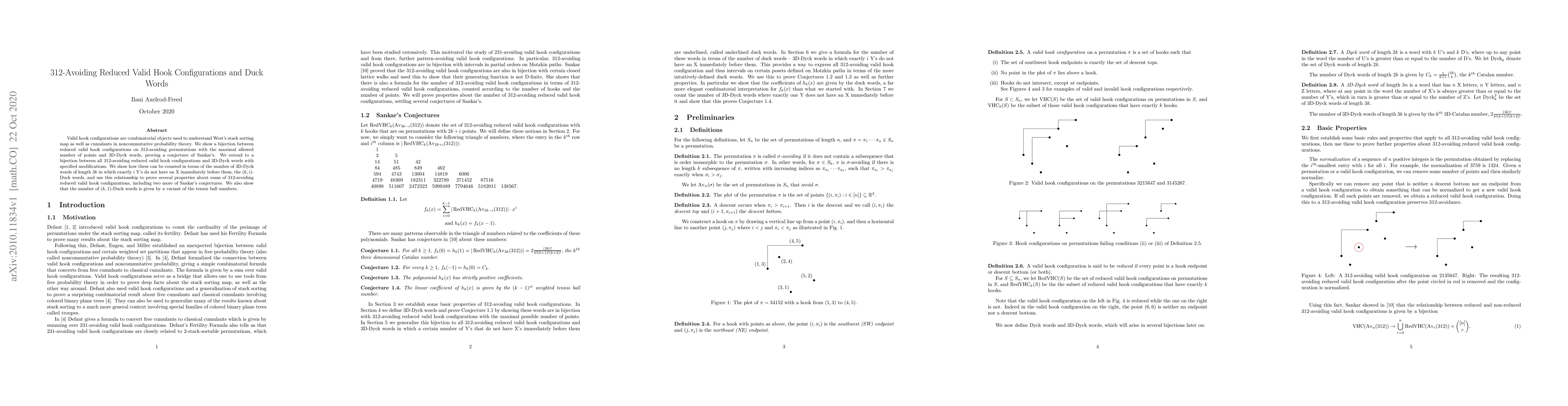 This paper establishes a bijection between 312-avoiding reduced valid hook configurations and 3D-Dyck words, proving Sankar's conjecture. It extends this to count these configurations using (k,i)-Duck words and demonstrates properties of sums of such configurations, including verifying additional conjectures.