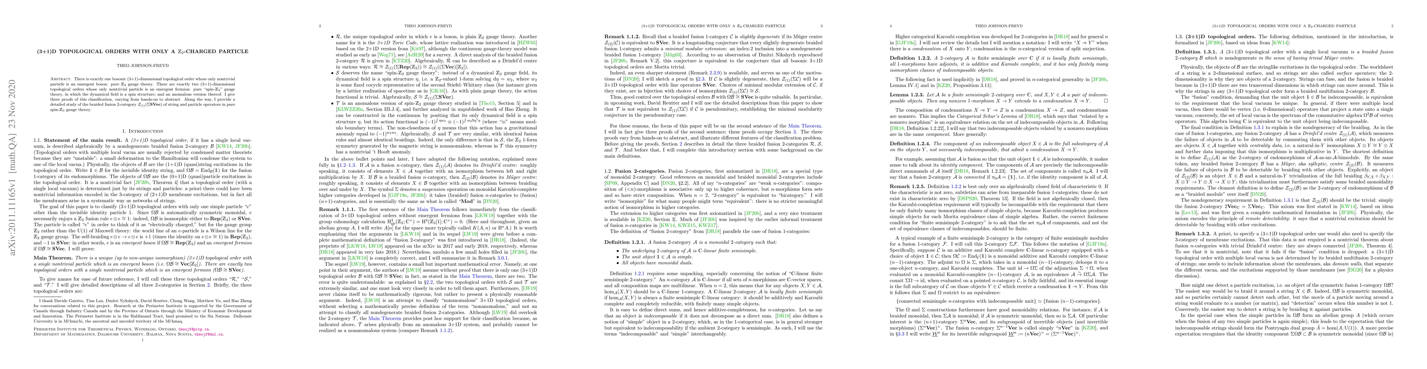 There is exactly one bosonic (3+1)-dimensional topological order whose only nontrivial particle is an emergent boson: pure $\mathbb{Z}_2$ gauge theory. There are exactly two (3+1)-dimensional topological orders whose only nontrivial particle is an emergent fermion: pure "spin-$\mathbb{Z}_2$" gauge theory, in which the dynamical field is a spin structure; and an anomalous version thereof. I give three proofs of this classification, varying from hands-on to abstract. Along the way, I provide a detailed study of the braided fusion $2$-category $\mathcal{Z}_{(1)}(\Sigma \mathbf{SVec})$ of string and particle operators in pure spin-$\mathbb{Z}_2$ gauge theory.