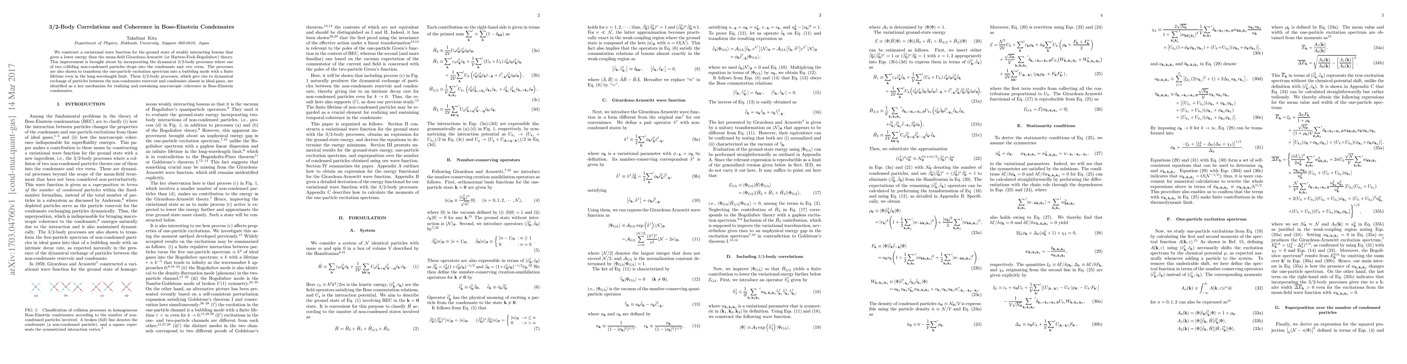 This paper develops a variational wave function for weakly interacting bosons that better captures 3/2-body correlations, improving upon mean-field theory. It identifies these correlations as crucial for sustaining macroscopic coherence and transforming the excitation spectrum into a finite-lifetime bubbling mode.