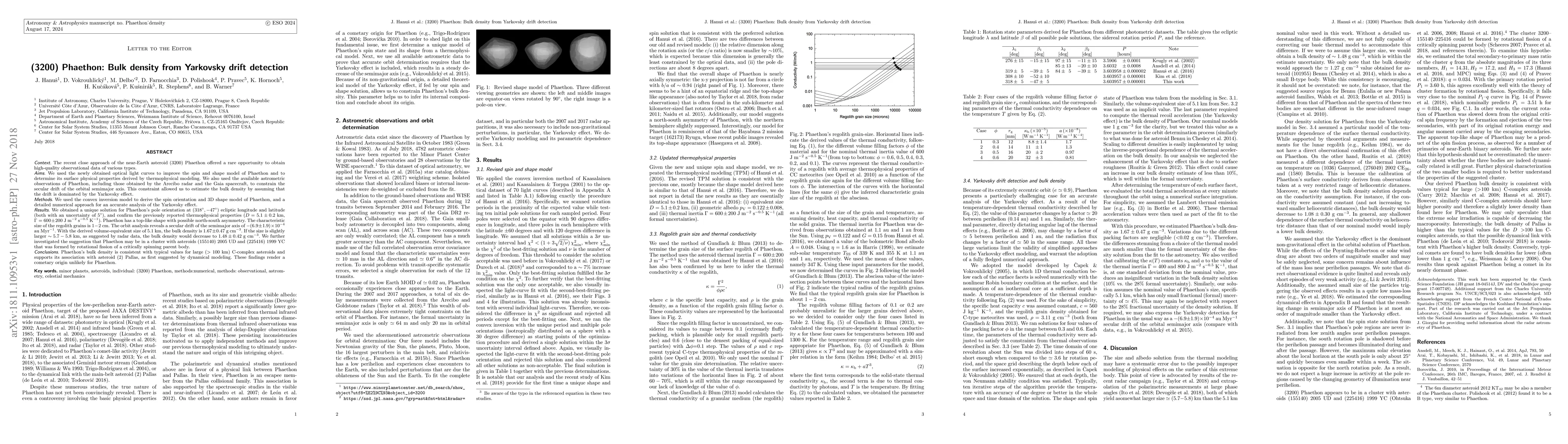 The recent close approach of the NEA (3200) Phaethon offered a rare opportunity to obtain high-quality observational data. We used the newly obtained optical light curves to improve the spin and shape model of Phaethon and to determine its surface physical properties derived by thermophysical modeling. We also used the available astrometric observations of Phaethon, including those obtained by the Arecibo radar and the Gaia spacecraft, to constrain the secular drift of the orbital semimajor axis. This constraint allowed us to estimate the bulk density by assuming that the drift is dominated by the Yarkovsky effect. We used the convex inversion model to derive the 3D shape model of Phaethon, and a detailed numerical approach for an accurate analysis of the Yarkovsky effect. We obtained a unique solution for Phaethon's pole orientation at $(318,-47)^{\circ}$ ecliptic longitude and latitude (uncertainty of $5^{\circ}$), and confirm the previously reported thermophysical properties ($D=5.1\pm0.2$ km, $\Gamma=600\pm200$ SI). Phaethon has a top-like shape with possible north-south asymmetry. The characteristic size of the regolith grains is 1-2 cm. The orbit analysis reveals a secular drift of the semimajor axis of $-(6.9\pm1.9)\times 10^{-4}$ au Myr$^{-1}$. With the derived volume-equivalent size of 5.1~km, the bulk density $\rho$ is $1.67\pm0.47$ g cm$^{-3}$. If the size is slightly larger $\sim5.7$ km, as suggested by radar data, $\rho$ would decrease to $1.48\pm0.42$ g cm$^{-3}$. We further investigated the suggestion that Phaethon may be in a cluster with asteroids (155140) 2005 UD and (225416) 1999 YC that was formed by rotational fission of a critically spinning parent body. Phaethon's $\rho$ is consistent with typical values for large ($>100$ km) C-complex asteroids and supports its association with asteroid (2) Pallas. These findings render a cometary origin unlikely for Phaethon.