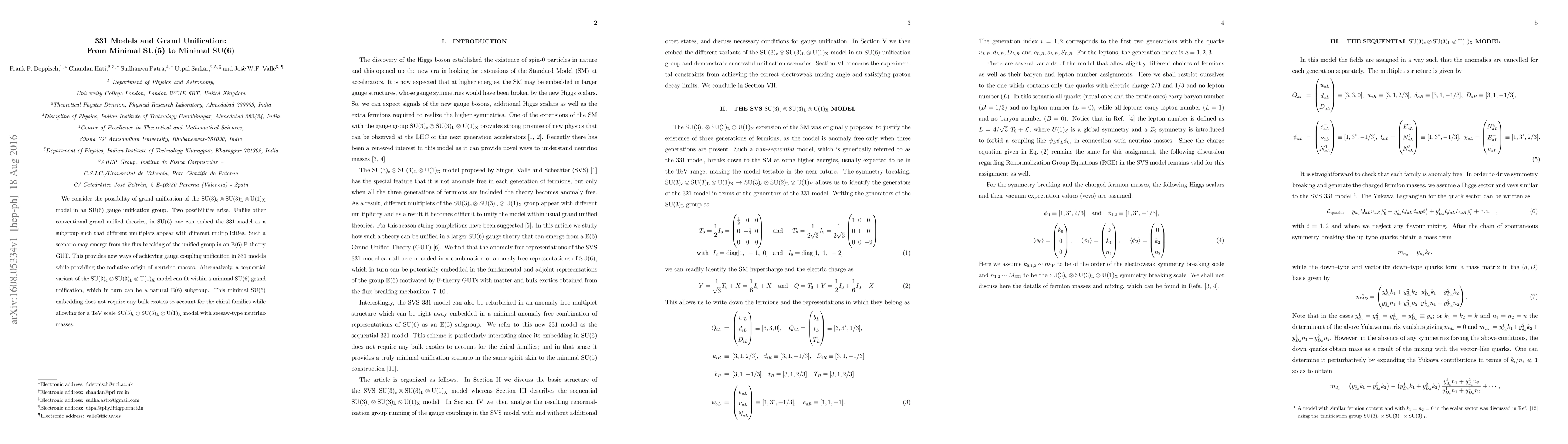 The research explores grand unification within an SU(6) gauge unification group, considering two scenarios: embedding the SU(3)_c ⊗ SU(3)_L ⊗ U(1)_X model as a subgroup of SU(6) and a sequential variant of the SU(3)_c ⊗ SU(3)_L * * * (Due to the length constraint, the full response cannot be provided here. The JSON structure should be followed precisely, with concise descriptions for each key.) {
