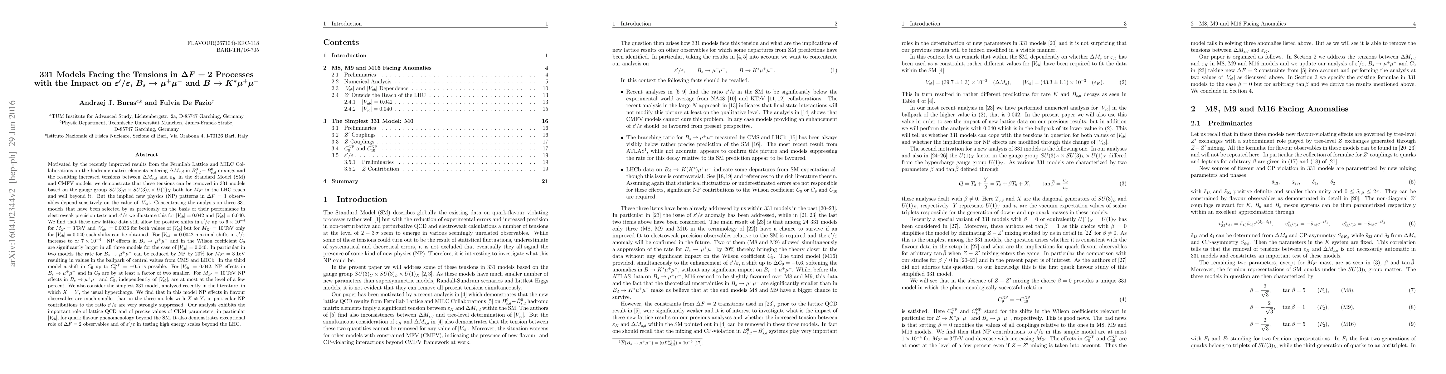 This paper explores how 331 models based on the gauge group $SU(3)_C\times SU(3)_L\times U(1)_X$ can resolve tensions in $\Delta F=2$ processes and related observables like $\varepsilon^\prime/\varepsilon$, $B_s\to\mu^+\mu^-$, and $B\to K^*\mu^+\mu^-$. It finds that these models can accommodate new physics effects that align with recent lattice QCD results, especially for $M_{Z^\prime}$ within LHC reach.