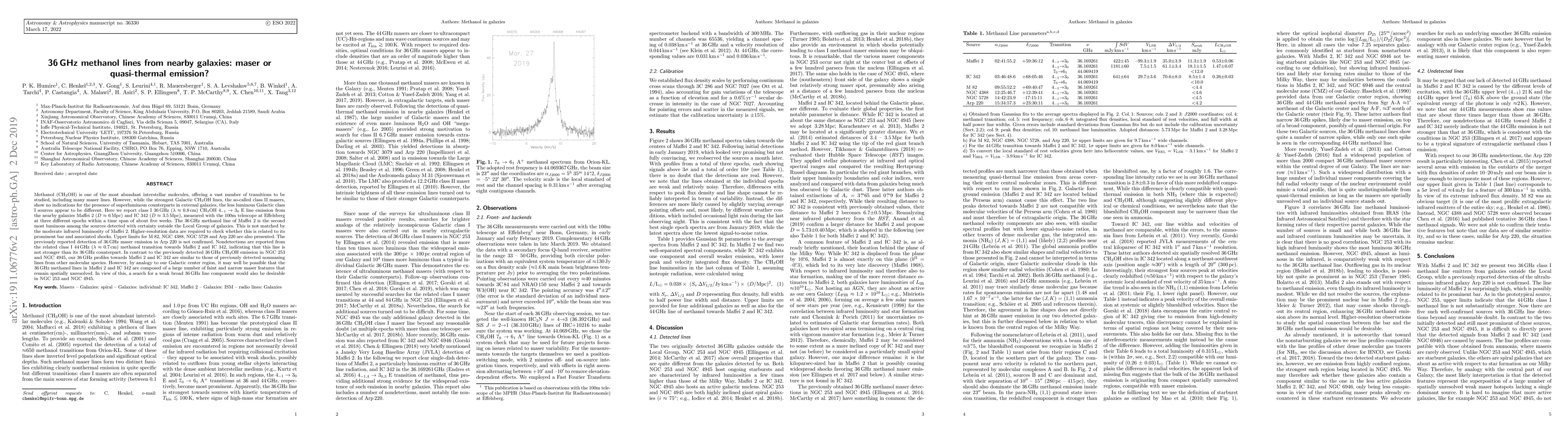 New research detects class I 36GHz methanol emission from nearby galaxies Maffei2 and IC342, challenging the understanding of maser vs quasi-thermal emission, with implications for understanding molecular evolution in galaxies.
