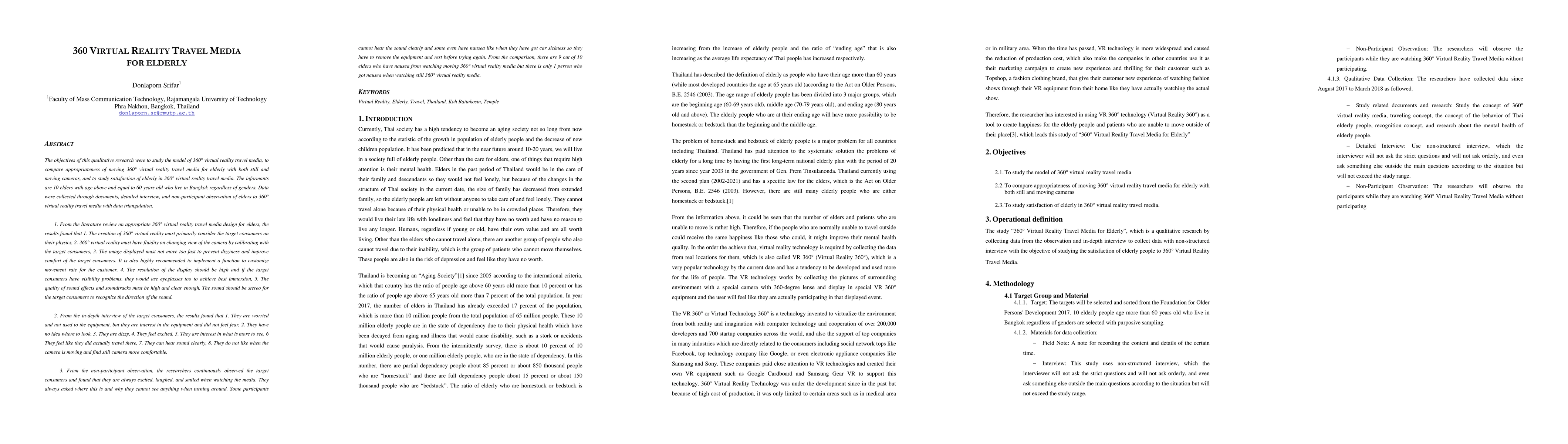 This qualitative study explores the use of 360-degree virtual reality travel media among elderly individuals in Bangkok, focusing on its appropriateness and satisfaction levels. Findings suggest that while still camera views are preferred, participants expressed excitement and a sense of actual travel, highlighting the potential of VR for elderly engagement.