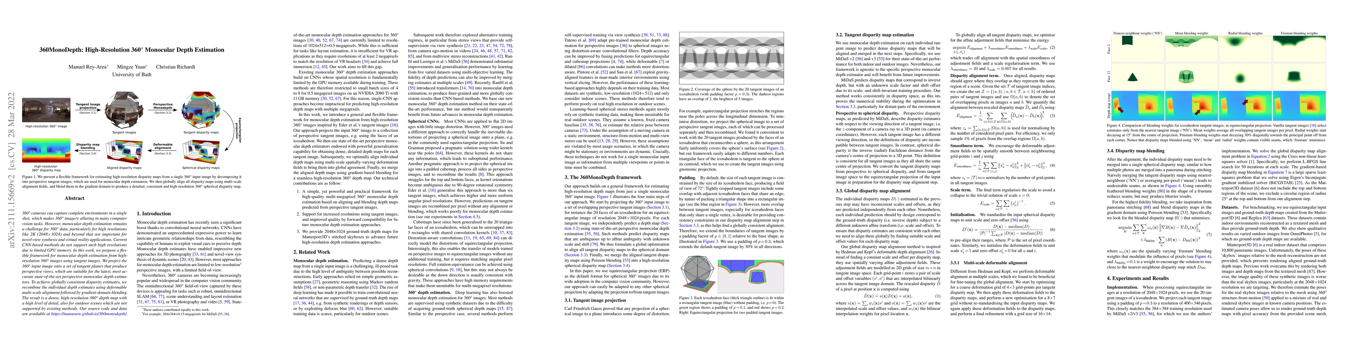 The paper proposes a framework for high-resolution 360° monocular depth estimation using tangent images to project 360° input onto perspective views, enabling accurate depth estimation with state-of-the-art methods. It combines depth estimates through deformable multi-scale alignment and gradient-domain blending for globally consistent results.