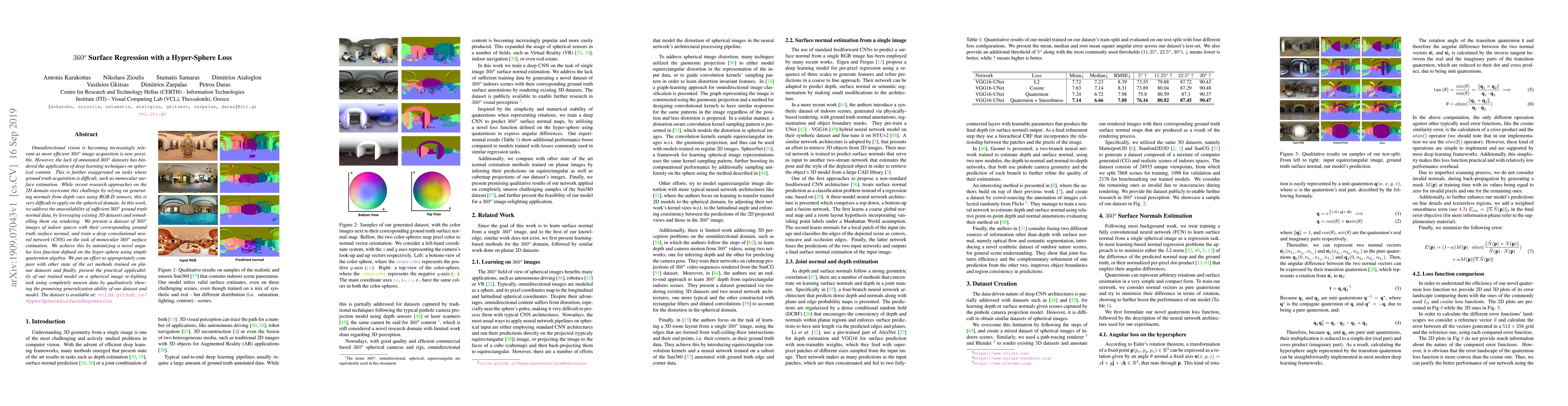 Omnidirectional vision is becoming increasingly relevant as more efficient $360^o$ image acquisition is now possible. However, the lack of annotated $360^o$ datasets has hindered the application of deep learning techniques on spherical content. This is further exaggerated on tasks where ground truth acquisition is difficult, such as monocular surface estimation. While recent research approaches on the 2D domain overcome this challenge by relying on generating normals from depth cues using RGB-D sensors, this is very difficult to apply on the spherical domain. In this work, we address the unavailability of sufficient $360^o$ ground truth normal data, by leveraging existing 3D datasets and remodelling them via rendering. We present a dataset of $360^o$ images of indoor spaces with their corresponding ground truth surface normal, and train a deep convolutional neural network (CNN) on the task of monocular 360 surface estimation. We achieve this by minimizing a novel angular loss function defined on the hyper-sphere using simple quaternion algebra. We put an effort to appropriately compare with other state of the art methods trained on planar datasets and finally, present the practical applicability of our trained model on a spherical image re-lighting task using completely unseen data by qualitatively showing the promising generalization ability of our dataset and model. The dataset is available at: vcl3d.github.io/HyperSphereSurfaceRegression.