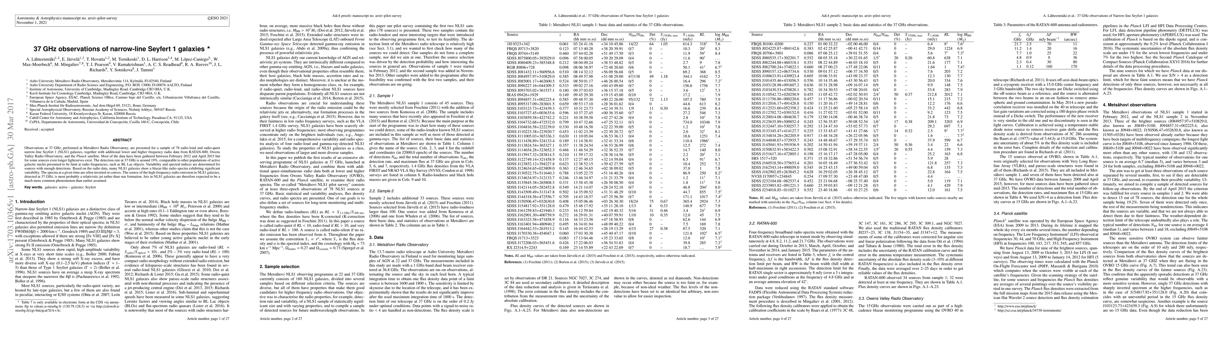 Observations at 37 GHz, performed at Mets\"ahovi Radio Observatory, are presented for a sample of 78 radio-loud and radio-quiet narrow-line Seyfert 1 (NLS1) galaxies, together with additional lower and higher frequency radio data from RATAN-600, Owens Valley Radio Observatory, and the Planck satellite. Most of the data have been gathered between February 2012 and April 2015 but for some sources even longer lightcurves exist. The detection rate at 37 GHz is around 19%, comparable to other populations of active galactic nuclei presumed to be faint at radio frequencies, such as BL Lac objects. Variability and spectral indices are determined for sources with enough detections. Based on the radio data, many NLS1 galaxies show a blazar-like radio spectra exhibiting significant variability. The spectra at a given time are often inverted or convex. The source of the high-frequency radio emission in NLS1 galaxies, detected at 37 GHz, is most probably a relativistic jet rather than star formation. Jets in NLS1 galaxies are therefore expected to be a much more common phenomenon than earlier assumed.