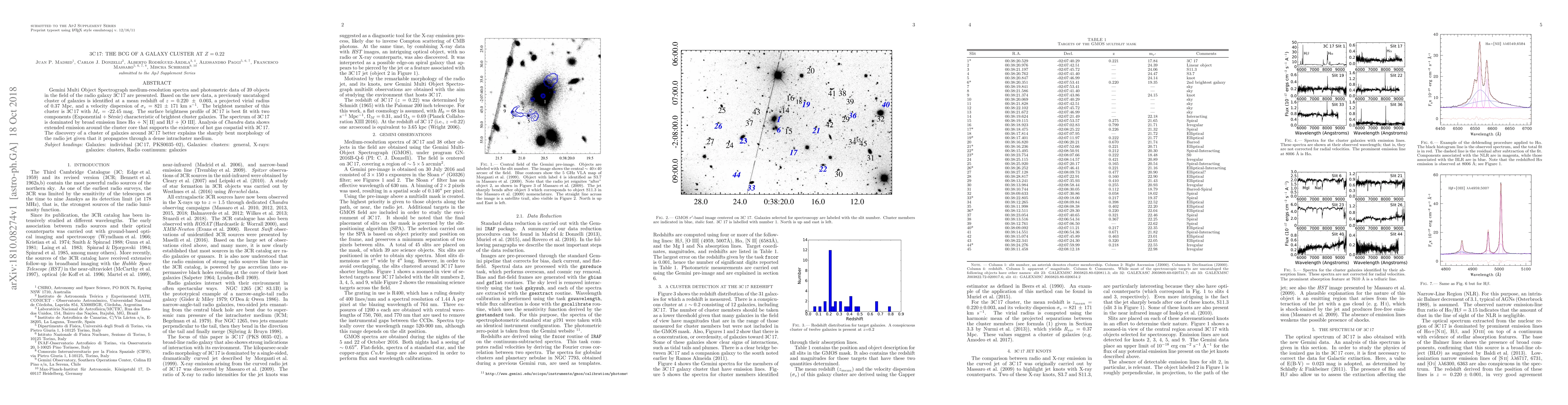 Gemini Multi Object Spectrograph medium-resolution spectra and photometric data of 39 objects in the field of the radio galaxy 3C 17 are presented. Based on the new data, a previously uncataloged cluster of galaxies is identified at a mean redshift of z=0.220 +/-0.003, a projected virial radius of 0.37 Mpc, and a velocity dispersion of sigma_v = 821 +/-171 km/s. The brightest member of this cluster is 3C 17 with M_r = -22.45 mag. The surface brightness profile of 3C 17 is best fit with two components (Exponential + Sersic) characteristic of brightest cluster galaxies. The spectrum of 3C 17 is dominated by broad emission lines Halpha + N[II] and Hbeta + [OIII]. Analysis of Chandra data shows extended emission around the cluster core that supports the existence of hot gas cospatial with 3C 17. The discovery of a cluster of galaxies around 3C 17 better explains the sharply bent morphology of the radio jet given that it propagates through a dense intracluster medium.