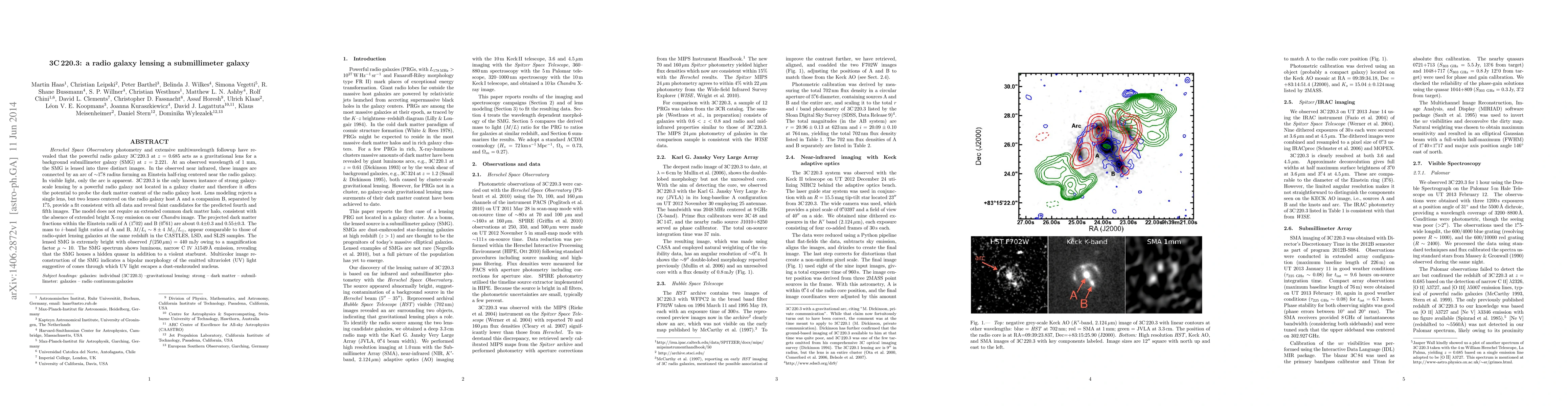 The powerful radio galaxy 3C 220.3 acts as a gravitational lens for a background submillimeter galaxy (SMG), revealing three lensed images at 1mm wavelength. The SMG also contains a hidden quasar in addition to a starburst, and the lensing model suggests the presence of two distinct lensing components within the radio galaxy host.