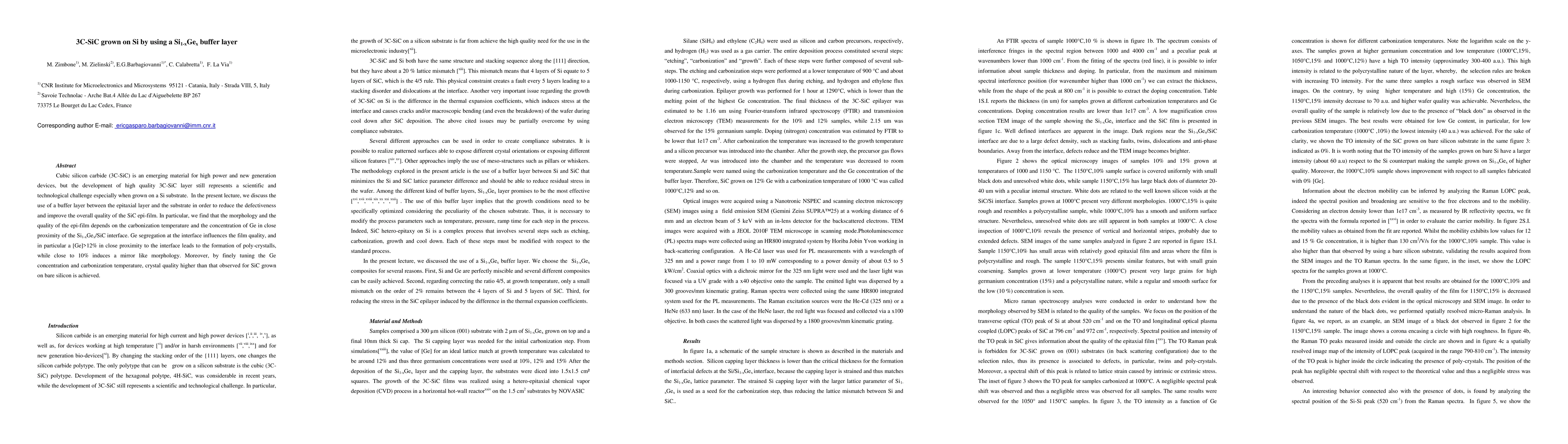 Cubic silicon carbide (3C-SiC) is an emerging material for high power and new generation devices, but the development of high quality 3C-SiC layer still represents a scientific and technological challenge especially when grown on a Si substrate. In the present lecture, we discuss the use of a buffer layer between the epitaxial layer and the substrate in order to reduce the defectiveness and improve the overall quality of the SiC epi-film. In particular, we find that the morphology and the quality of the epi-film depends on the carbonization temperature and the concentration of Ge in close proximity of the Si1-xGex/SiC interface. Ge segregation at the interface influences the film quality, and in particular a [Ge]>12% in close proximity to the interface leads to the formation of poly-crystalls, while close to 10% induces a mirror like morphology. Moreover, by finely tuning the Ge concentration and carbonization temperature, crystal quality higher than that observed for SiC grown on bare silicon is achieved.