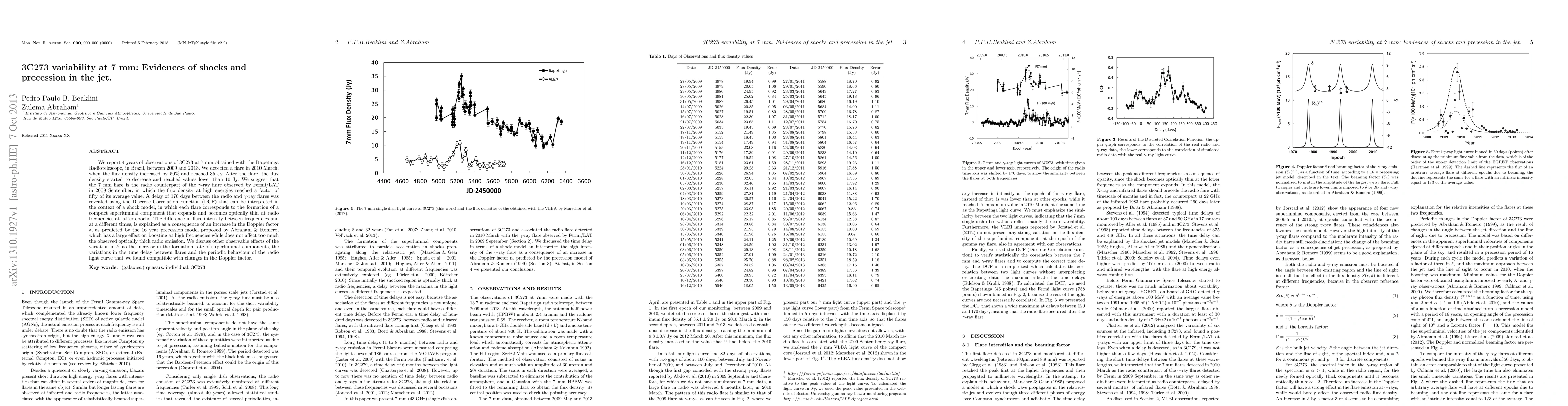 We report 4 years of observations of 3C273 at 7 mm obtained with the Itapetinga Radiotelescope, in Brazil, between 2009 and 2013. We detected a flare in 2010 March, when the flux density increased by 50% and reached 35 Jy. After the flare, the flux density started to decrease and reached values lower than 10 Jy. We suggest that the 7 mm flare is the radio counterpart of the $\gamma$-ray flare observed by Fermi/LAT in 2009 September, in which the flux density at high energies reached a factor of fifty of its average value. A delay of 170 days between the radio and $\gamma$-ray flares was revealed using the Discrete Correlation Function (DCF) that can be interpreted in the context of a shock model, in which each flare corresponds to the formation of a compact superluminal component that expands and becomes optically thin at radio frequencies at latter epochs. The difference in flare intensity between frequencies and at a different times, is explained as a consequence of an increase in the Doppler factor $\delta$, as predicted by the 16 year precession model proposed by Abraham & Romero, which has a large effect on boosting at high frequencies while does not affect too much the observed optically thick radio emission. We discuss other observable effects of the variation in $\delta$, as the increase in the formation rate of superluminal components, the variations in the time delay between flares and the periodic behaviour of the radio light curve that we found compatible with changes in the Doppler factor.