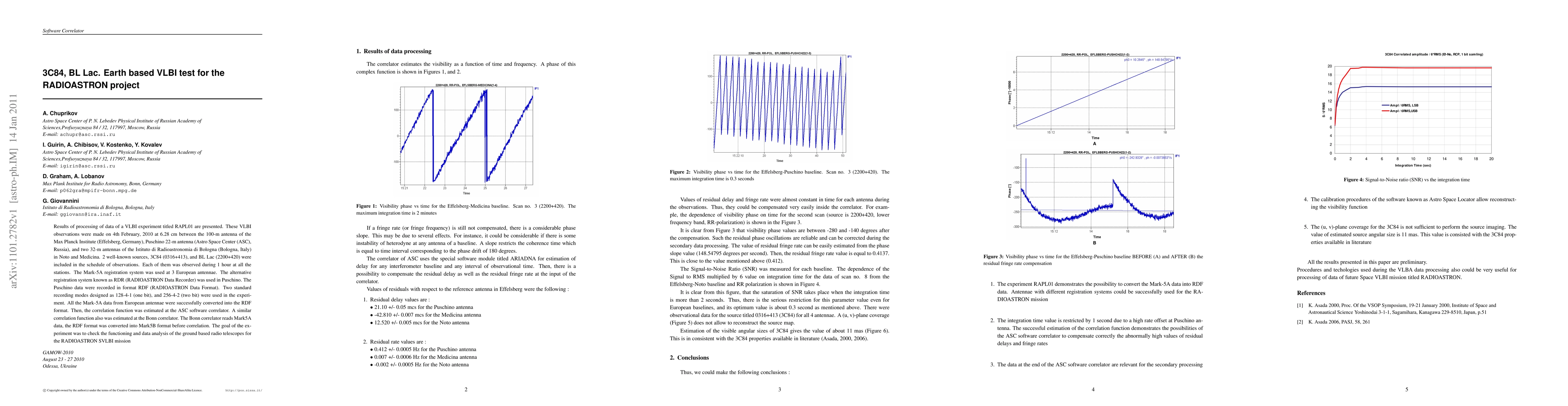 This paper presents results from a VLBI experiment (RAPL01) conducted on February 4, 2010, involving multiple radio telescopes to observe the sources 3C84 and BL Lac. The goal was to assess the functioning of ground-based radio telescopes for the RADIOASTRON SVLBI mission.