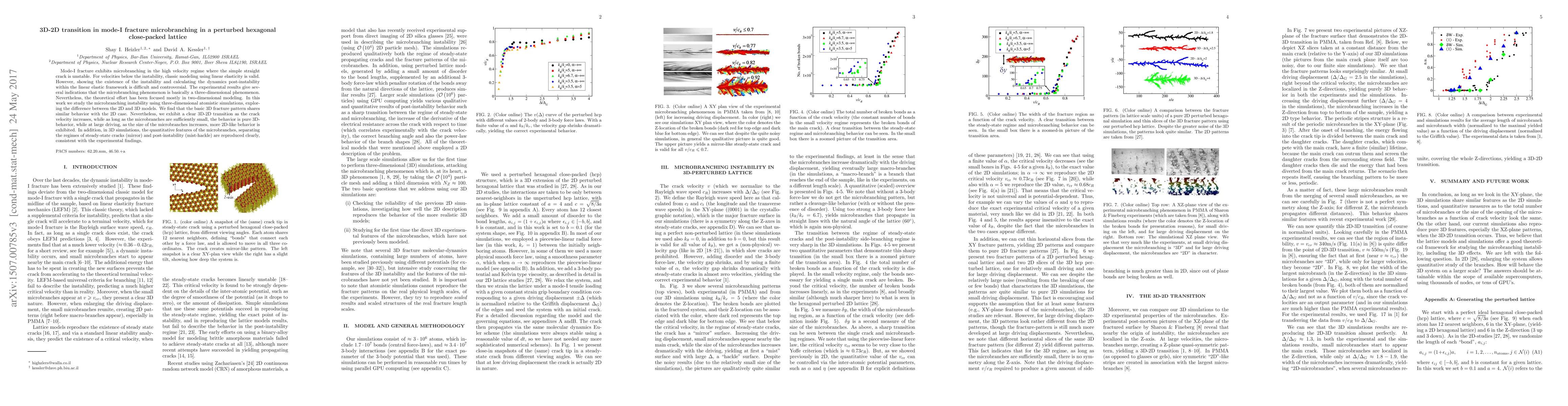 Mode-I fracture exhibits microbranching in the high velocity regime where the simple straight crack is unstable. For velocities below the instability, classic modeling using linear elasticity is valid. However, showing the existence of the instability and calculating the dynamics post-instability within the linear elastic framework is difficult and controversial. The experimental results give several indications that the microbranching phenomenon is basically a three-dimensional phenomenon. Nevertheless, the theoretical effort has been focused mostly in two-dimensional modeling. In this work we study the microbranching instability using three-dimensional atomistic simulations, exploring the difference between the 2D and 3D models. We find that the basic 3D fracture pattern shares similar behavior with the 2D case. Nevertheless, we exhibit a clear 3D-2D transition as the crack velocity increases, while as long as the microbranches are sufficiently small, the behavior is pure 3D-behavior, while at large driving, as the size of the microbranches increases, more 2D-like behavior is exhibited. In addition, in 3D simulations, the quantitative features of the microbranches, separating the regimes of steady-state cracks (mirror) and post-instability (mist-hackle) are reproduced clearly, consistent with the experimental findings.