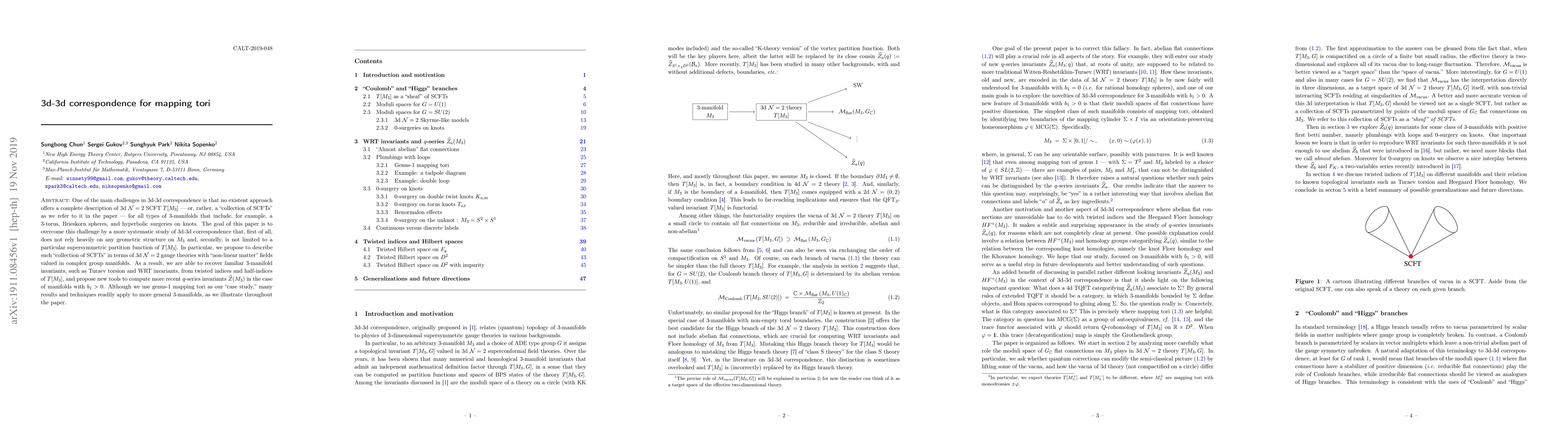 One of the main challenges in 3d-3d correspondence is that no existent approach offers a complete description of 3d $N=2$ SCFT $T[M_3]$ --- or, rather, a "collection of SCFTs" as we refer to it in the paper --- for all types of 3-manifolds that include, for example, a 3-torus, Brieskorn spheres, and hyperbolic surgeries on knots. The goal of this paper is to overcome this challenge by a more systematic study of 3d-3d correspondence that, first of all, does not rely heavily on any geometric structure on $M_3$ and, secondly, is not limited to a particular supersymmetric partition function of $T[M_3]$. In particular, we propose to describe such "collection of SCFTs" in terms of 3d $N=2$ gauge theories with "non-linear matter'' fields valued in complex group manifolds. As a result, we are able to recover familiar 3-manifold invariants, such as Turaev torsion and WRT invariants, from twisted indices and half-indices of $T[M_3]$, and propose new tools to compute more recent $q$-series invariants $\hat Z (M_3)$ in the case of manifolds with $b_1 > 0$. Although we use genus-1 mapping tori as our "case study," many results and techniques readily apply to more general 3-manifolds, as we illustrate throughout the paper.