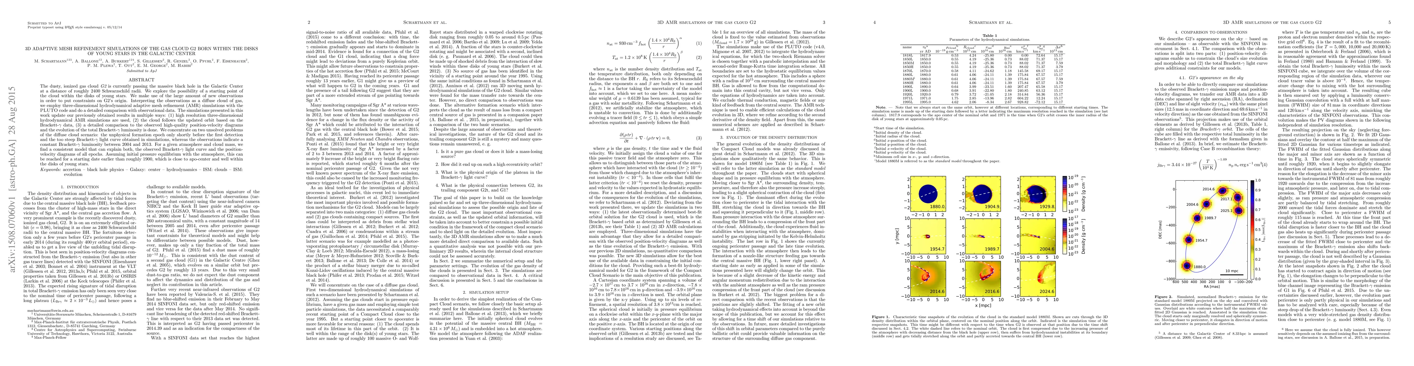 The dusty, ionized gas cloud G2 is currently passing the massive black hole in the Galactic Center at a distance of roughly 2400 Schwarzschild radii. We explore the possibility of a starting point of the cloud within the disks of young stars. We make use of the large amount of new observations in order to put constraints on G2's origin. Interpreting the observations as a diffuse cloud of gas, we employ three-dimensional hydrodynamical adaptive mesh refinement (AMR) simulations with the PLUTO code and do a detailed comparison with observational data. The simulations presented in this work update our previously obtained results in multiple ways: (1) high resolution three-dimensional hydrodynamical AMR simulations are used, (2) the cloud follows the updated orbit based on the Brackett-$\gamma$ data, (3) a detailed comparison to the observed high-quality position-velocity diagrams and the evolution of the total Brackett-$\gamma$ luminosity is done. We concentrate on two unsolved problems of the diffuse cloud scenario: the unphysical formation epoch only shortly before the first detection and the too steep Brackett-$\gamma$ light curve obtained in simulations, whereas the observations indicate a constant Brackett-$\gamma$ luminosity between 2004 and 2013. For a given atmosphere and cloud mass, we find a consistent model that can explain both, the observed Brackett-$\gamma$ light curve and the position-velocity diagrams of all epochs. Assuming initial pressure equilibrium with the atmosphere, this can be reached for a starting date earlier than roughly 1900, which is close to apo-center and well within the disks of young stars.