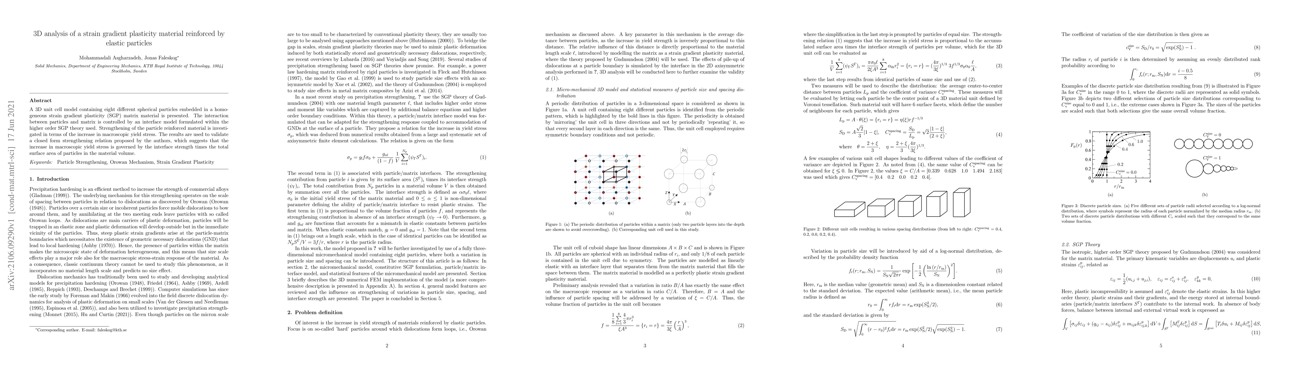 This paper presents a 3D unit cell model of a strain gradient plasticity matrix reinforced by elastic particles, investigating the interaction between particles and matrix using higher order SGP theory. The study validates a proposed strengthening relation indicating that macroscopic yield stress increase is proportional to interface strength and total surface area of particles.