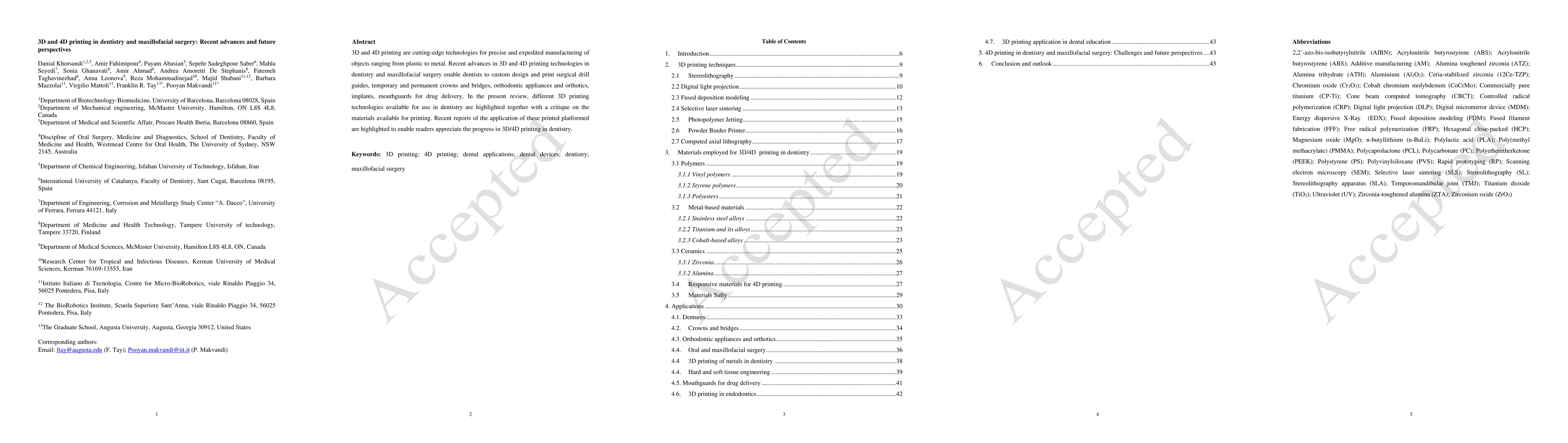 This paper reviews recent advances in 3D and 4D printing technologies in dentistry and maxillofacial surgery, highlighting their applications in custom-designed surgical tools, crowns, implants, and drug delivery devices. It critiques the materials used and discusses the future potential of these technologies in dental care.