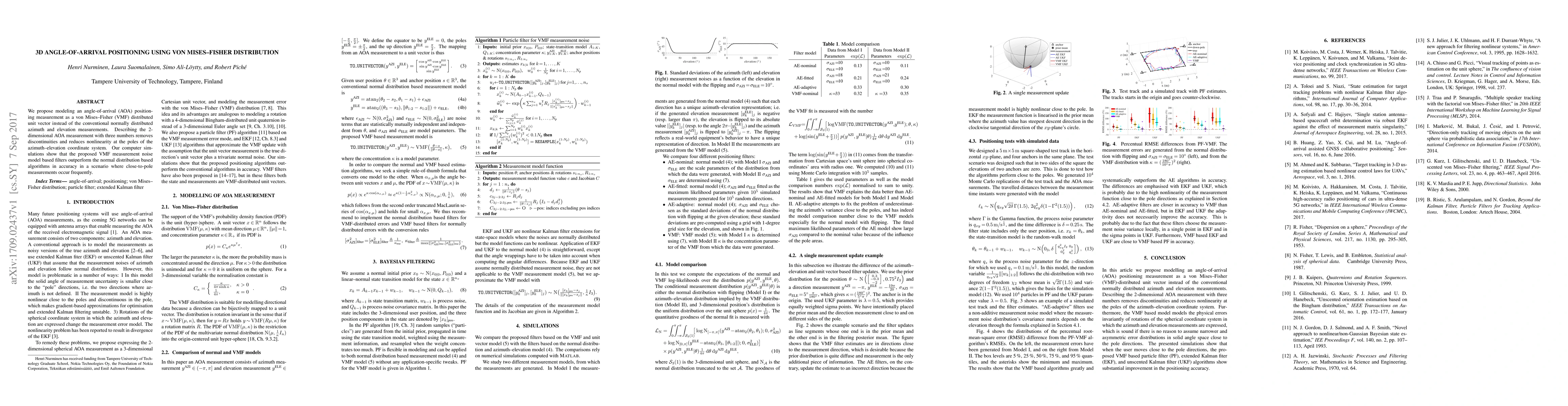 The paper proposes modeling angle-of-arrival (AOA) positioning measurements using a von Mises-Fisher (VMF) distributed unit vector instead of conventional normally distributed azimuth and elevation measurements.
