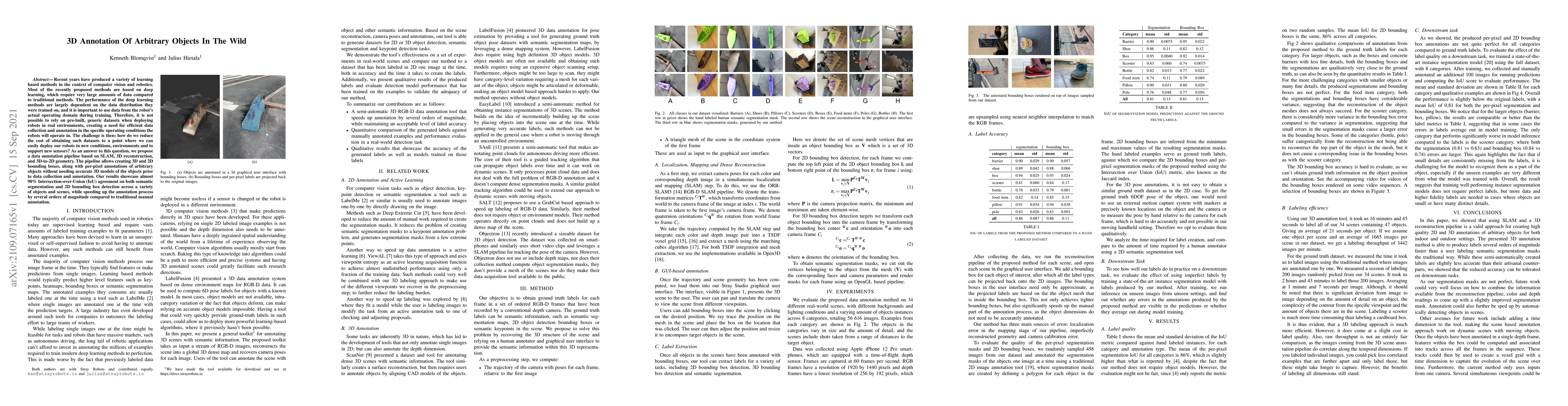 Recent years have produced a variety of learning based methods in the context of computer vision and robotics. Most of the recently proposed methods are based on deep learning, which require very large amounts of data compared to traditional methods. The performance of the deep learning methods are largely dependent on the data distribution they were trained on, and it is important to use data from the robot's actual operating domain during training. Therefore, it is not possible to rely on pre-built, generic datasets when deploying robots in real environments, creating a need for efficient data collection and annotation in the specific operating conditions the robots will operate in. The challenge is then: how do we reduce the cost of obtaining such datasets to a point where we can easily deploy our robots in new conditions, environments and to support new sensors? As an answer to this question, we propose a data annotation pipeline based on SLAM, 3D reconstruction, and 3D-to-2D geometry. The pipeline allows creating 3D and 2D bounding boxes, along with per-pixel annotations of arbitrary objects without needing accurate 3D models of the objects prior to data collection and annotation. Our results showcase almost 90% Intersection-over-Union (IoU) agreement on both semantic segmentation and 2D bounding box detection across a variety of objects and scenes, while speeding up the annotation process by several orders of magnitude compared to traditional manual annotation.