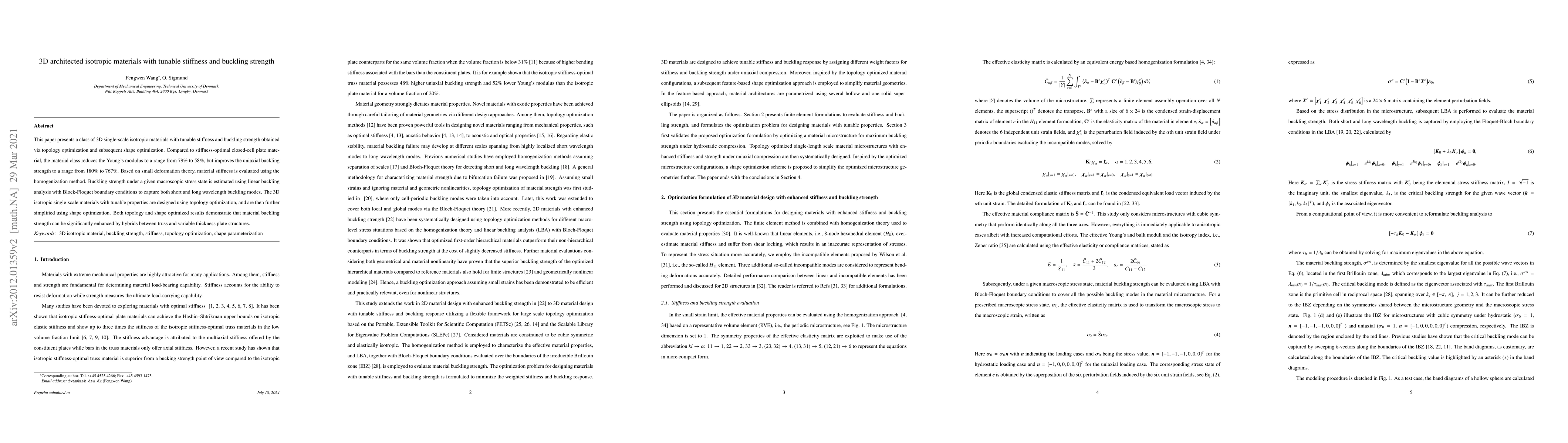 This paper introduces 3D architected isotropic materials with tunable stiffness and enhanced buckling strength, achieved through topology and shape optimization. These materials achieve lower Young's modulus but significantly higher uniaxial buckling strength compared to conventional materials.