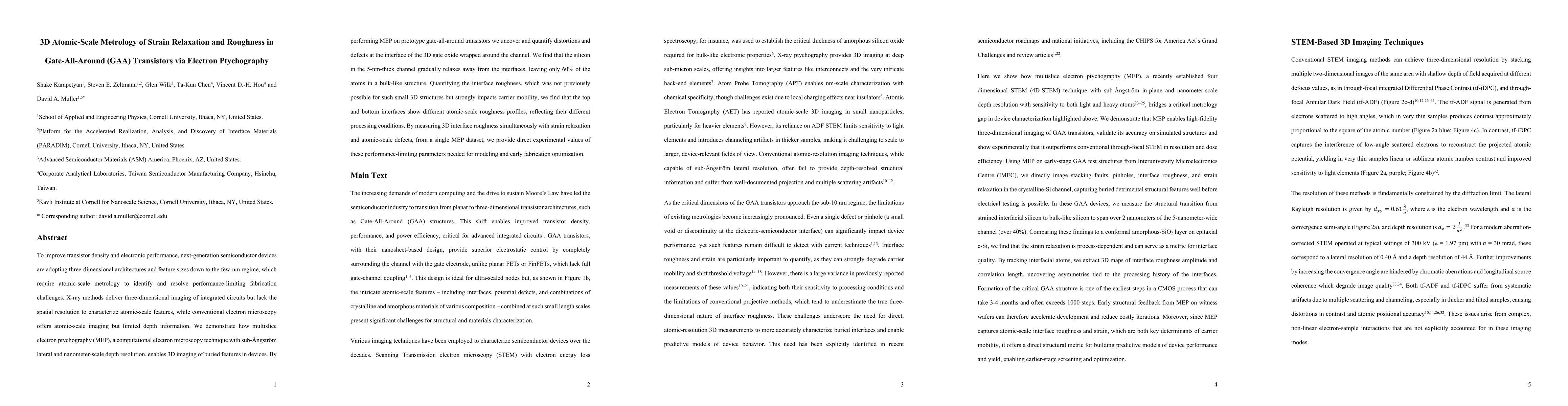 To improve transistor density and electronic performance, next-generation semiconductor devices are adopting three-dimensional architectures and feature sizes down to the few-nm regime, which require atomic-scale metrology to identify and resolve performance-limiting fabrication challenges. X-ray methods deliver three-dimensional imaging of integrated circuits but lack the spatial resolution to characterize atomic-scale features, while conventional electron microscopy offers atomic-scale imaging but limited depth information. We demonstrate how multislice electron ptychography (MEP), a computational electron microscopy technique with sub-\r{A}ngstr\"om lateral and nanometer-scale depth resolution, enables 3D imaging of buried features in devices. By performing MEP on prototype gate-all-around transistors we uncover and quantify distortions and defects at the interface of the 3D gate oxide wrapped around the channel. We find that the silicon in the 5-nm-thick channel gradually relaxes away from the interfaces, leaving only 60% of the atoms in a bulk-like structure. Quantifying the interface roughness, which was not previously possible for such small 3D structures but strongly impacts carrier mobility, we find that the top and bottom interfaces show different atomic-scale roughness profiles, reflecting their different processing conditions. By measuring 3D interface roughness simultaneously with strain relaxation and atomic-scale defects, from a single MEP dataset, we provide direct experimental values of these performance-limiting parameters needed for modeling and early fabrication optimization.