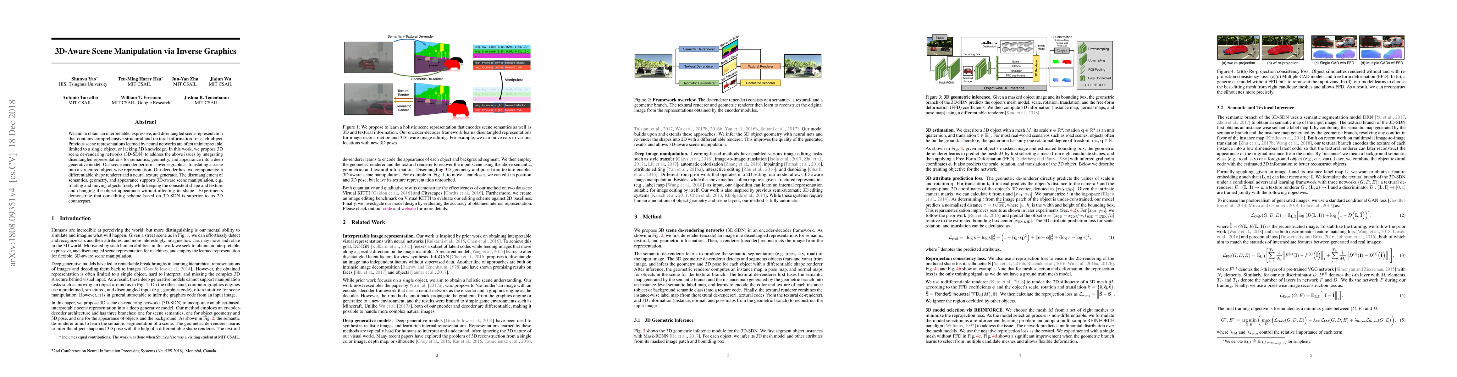 This paper proposes 3D scene de-rendering networks (3D-SDN) to create an interpretable, disentangled scene representation that integrates semantics, geometry, and appearance. The method enables 3D-aware scene manipulation, allowing for object transformations without altering shape or texture, outperforming 2D editing techniques.