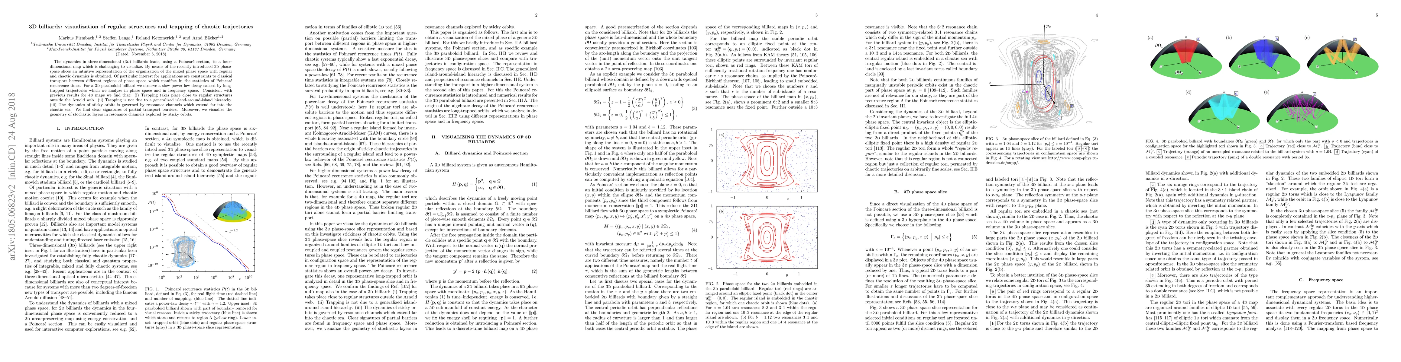 The dynamics in three-dimensional billiards leads, using a Poincar\'e section, to a four-dimensional map which is challenging to visualize. By means of the recently introduced 3D phase-space slices an intuitive representation of the organization of the mixed phase space with regular and chaotic dynamics is obtained. Of particular interest for applications are constraints to classical transport between different regions of phase space which manifest in the statistics of Poincar\'e recurrence times. For a 3D paraboloid billiard we observe a slow power-law decay caused by long-trapped trajectories which we analyze in phase space and in frequency space. Consistent with previous results for 4D maps we find that: (i) Trapping takes place close to regular structures outside the Arnold web. (ii) Trapping is not due to a generalized island-around-island hierarchy. (iii) The dynamics of sticky orbits is governed by resonance channels which extend far into the chaotic sea. We find clear signatures of partial transport barriers. Moreover, we visualize the geometry of stochastic layers in resonance channels explored by sticky orbits.