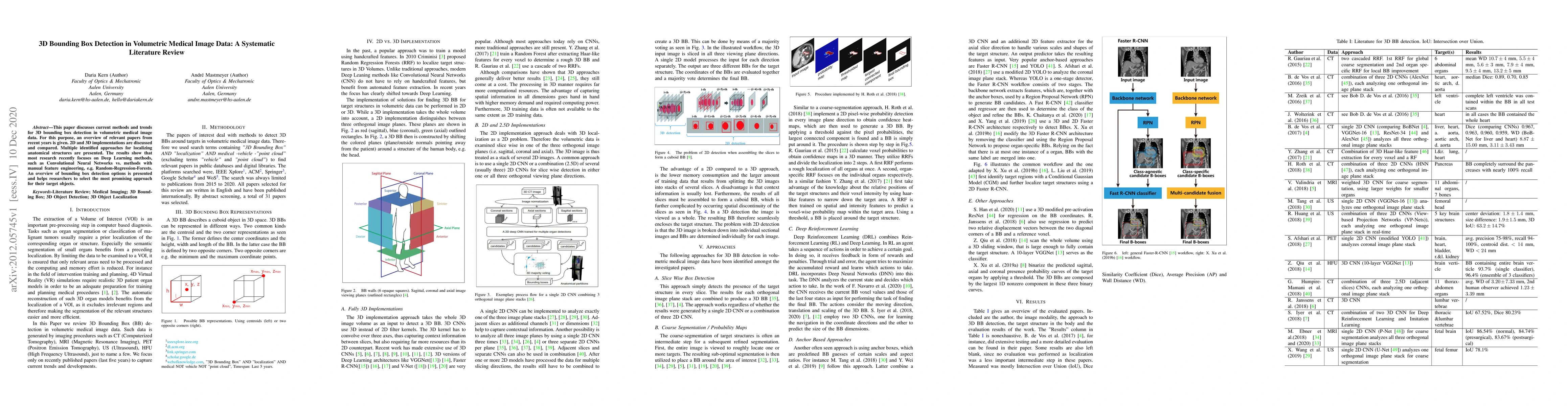 This paper discusses current methods and trends for 3D bounding box detection in volumetric medical image data. For this purpose, an overview of relevant papers from recent years is given. 2D and 3D implementations are discussed and compared. Multiple identified approaches for localizing anatomical structures are presented. The results show that most research recently focuses on Deep Learning methods, such as Convolutional Neural Networks vs. methods with manual feature engineering, e.g. Random-Regression-Forests. An overview of bounding box detection options is presented and helps researchers to select the most promising approach for their target objects.