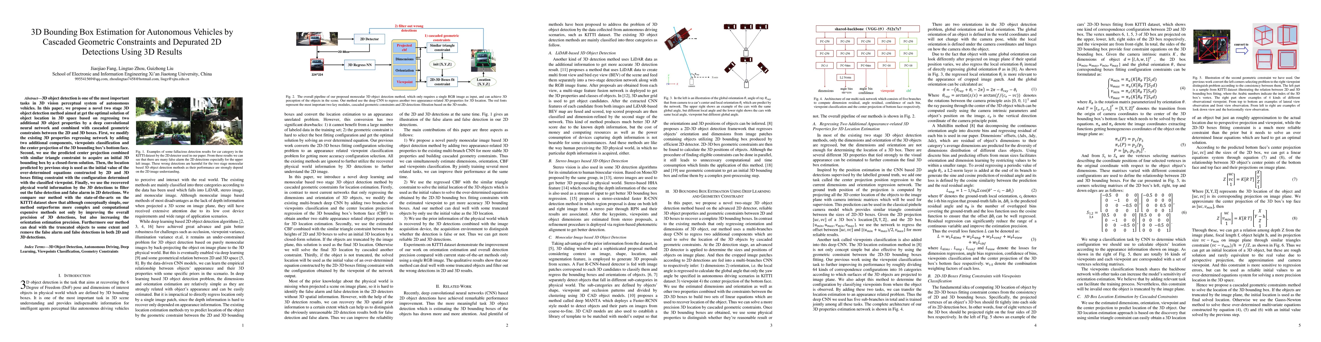 3D object detection is one of the most important tasks in 3D vision perceptual system of autonomous vehicles. In this paper, we propose a novel two stage 3D object detection method aimed at get the optimal solution of object location in 3D space based on regressing two additional 3D object properties by a deep convolutional neural network and combined with cascaded geometric constraints between the 2D and 3D boxes. First, we modify the existing 3D properties regressing network by adding two additional components, viewpoints classification and the center projection of the 3D bounding box s bottom face. Second, we use the predicted center projection combined with similar triangle constraint to acquire an initial 3D bounding box by a closed-form solution. Then, the location predicted by previous step is used as the initial value of the over-determined equations constructed by 2D and 3D boxes fitting constraint with the configuration determined with the classified viewpoint. Finally, we use the recovered physical world information by the 3D detections to filter out the false detection and false alarm in 2D detections. We compare our method with the state-of-the-arts on the KITTI dataset show that although conceptually simple, our method outperforms more complex and computational expensive methods not only by improving the overall precision of 3D detections, but also increasing the orientation estimation precision. Furthermore our method can deal with the truncated objects to some extent and remove the false alarm and false detections in both 2D and 3D detections.